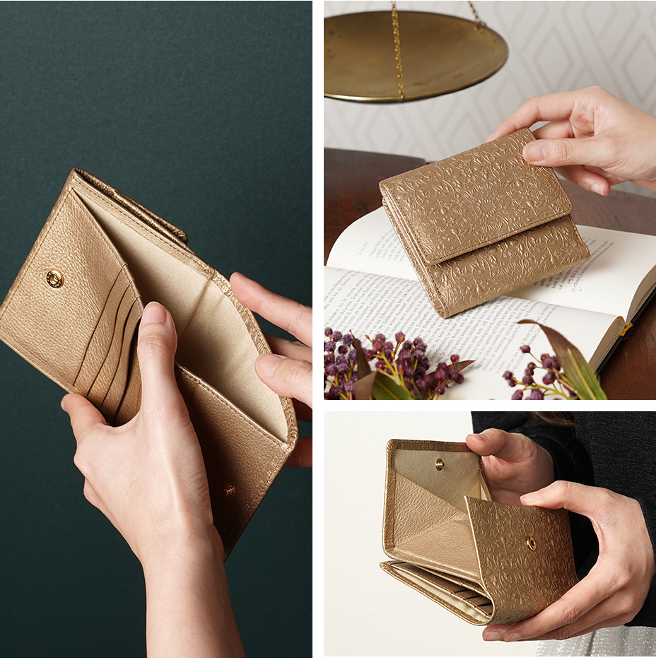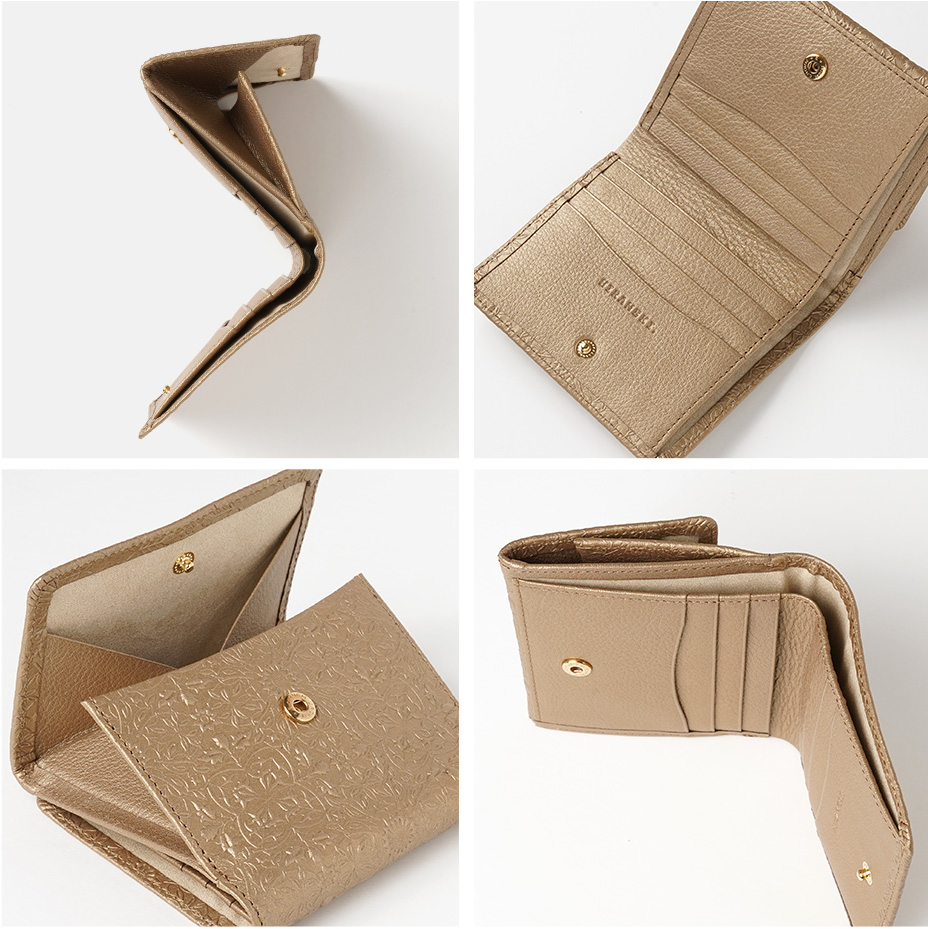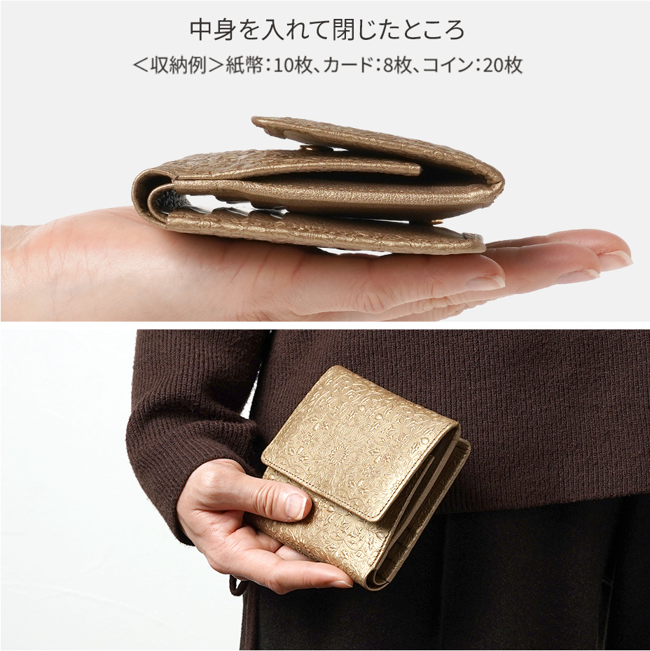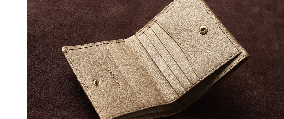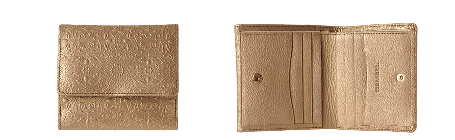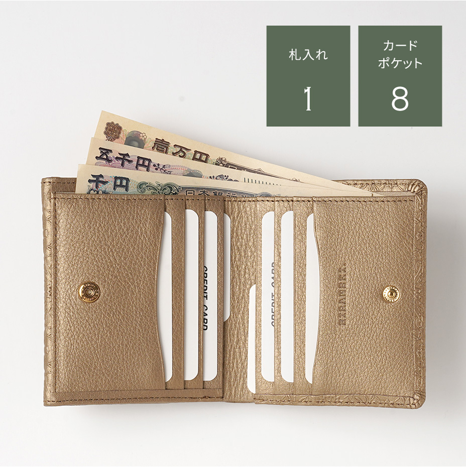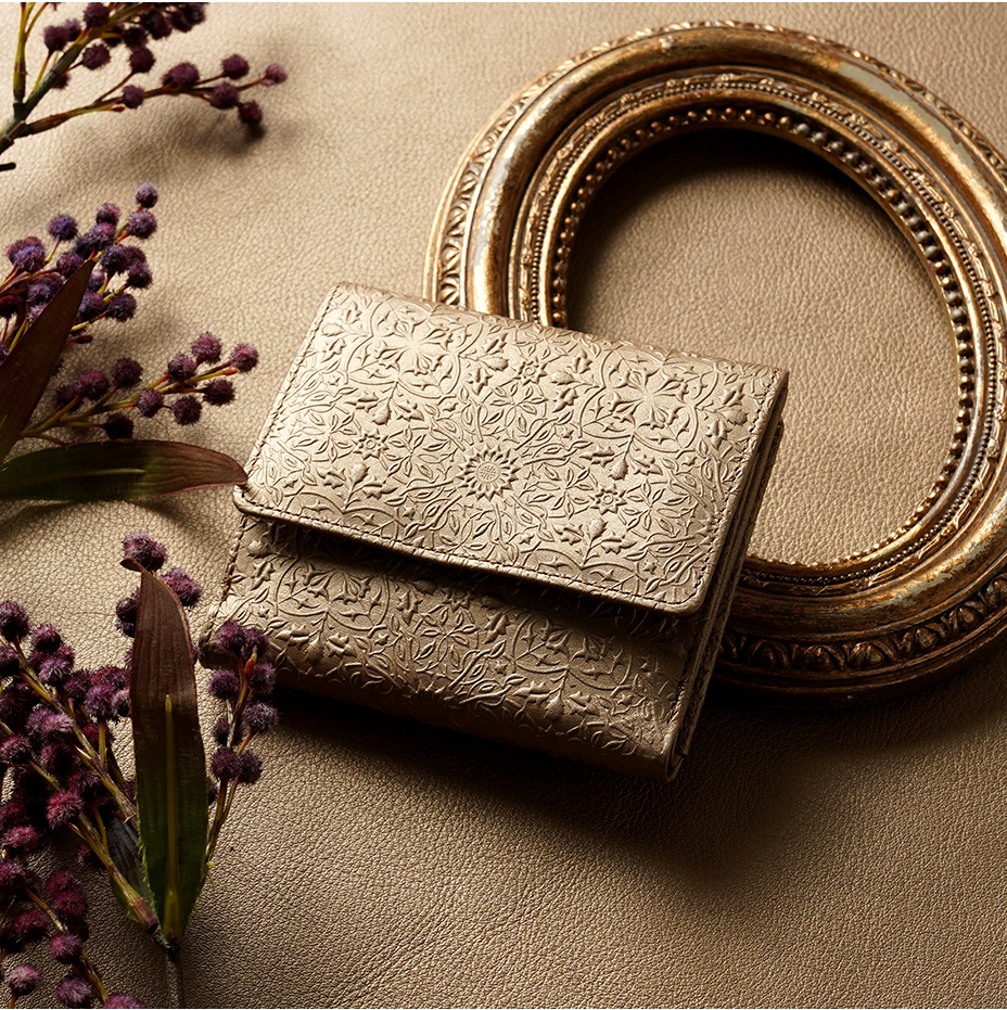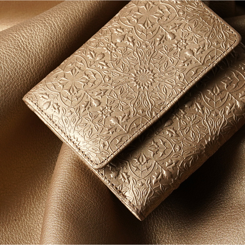 ウィリアム・モリスの美しい植物模様を革に型押しした、上品な輝きを持つメタリックカラーの二つ折り財布です。メインのお財布としての十分な収納力を備え、大きく開くBOX型の小銭入れもご好評をいただいています。