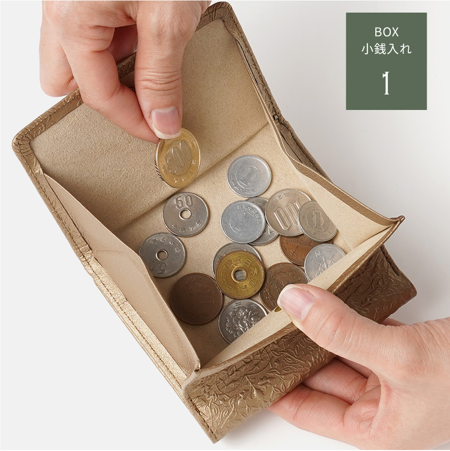 外側に独立したBOXタイプの小銭入れは、大きく開いて中が見やすく、出し入れもスムーズ。S字フォルムで中身が増えても膨らみを最小限に抑え、スリムな形状を保ちます。