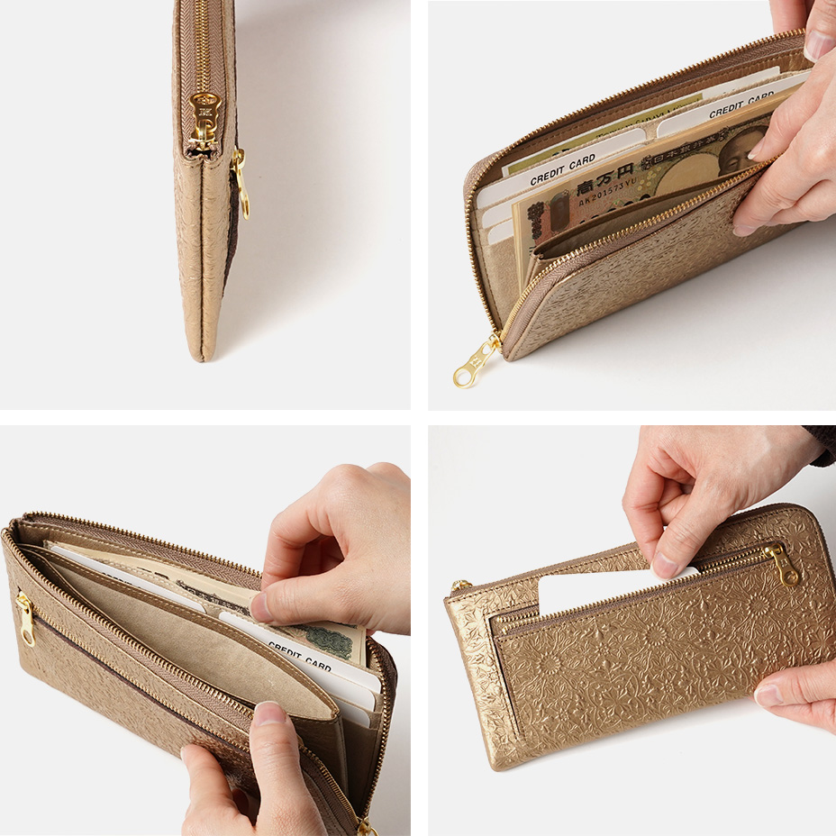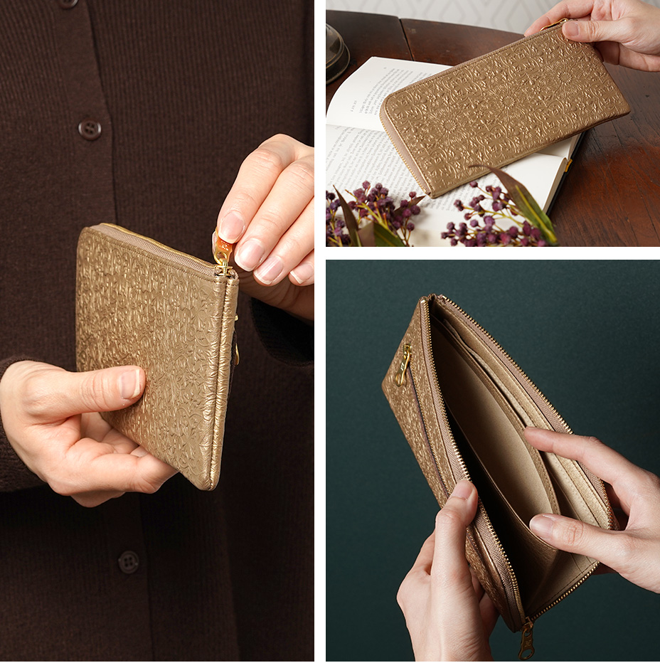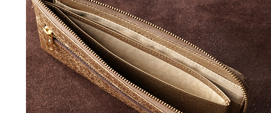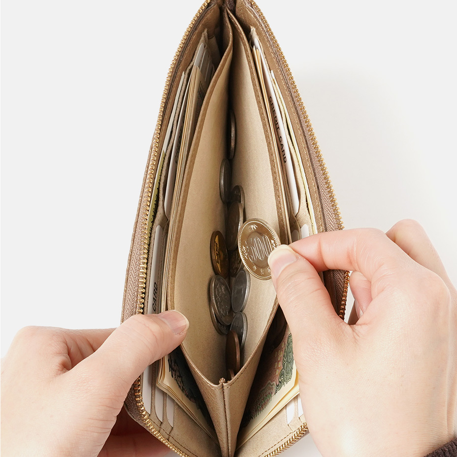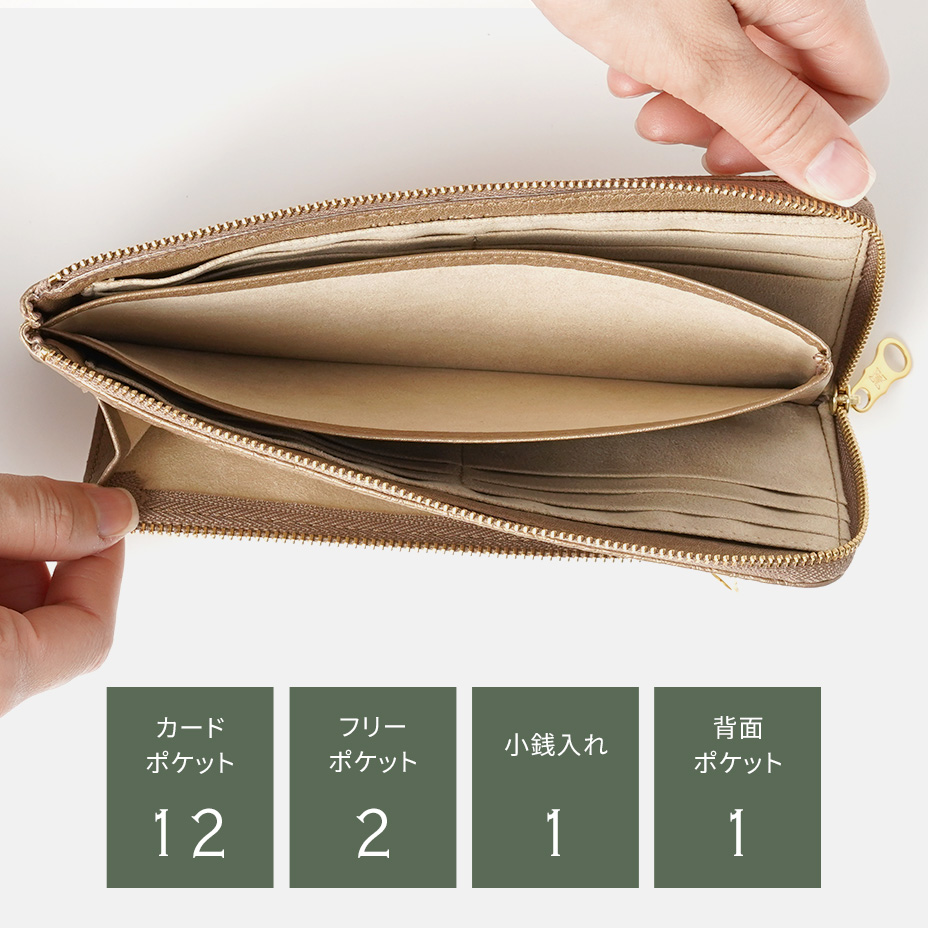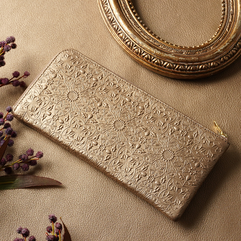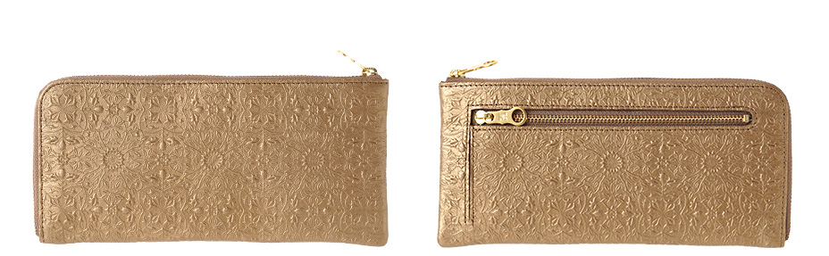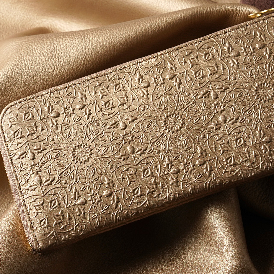 ウィリアム・モリスの美しい植物模様を革に型押しした、上品に輝くメタリックカラーのスリムな薄型長財布です。開閉しやすいL字ファスナー1つ開くだけで中身全てにアクセスでき、背面ポケットも有用で、リピート率の高い人気の型です。