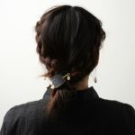 ①髪をヘアゴムで仕上げたい形にまとめる。②結び目の上からレザーパーツを被せ、ゴムの上部の髪にスティックを挿す。(POINT:最初に片側の穴にスティックを挿した状態で被せるとスムーズに装着できます)③金属キャップを留める。