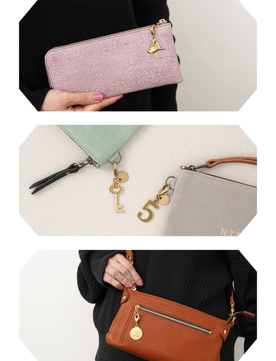 バッグやお財布、ポーチなどの引き手に付けたり、シンプルなアイテムに添えるだけで、ぐっと華やぐアイテムです。