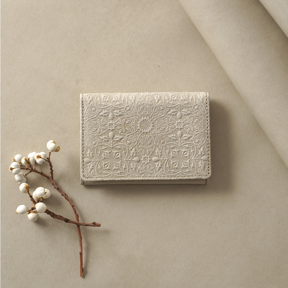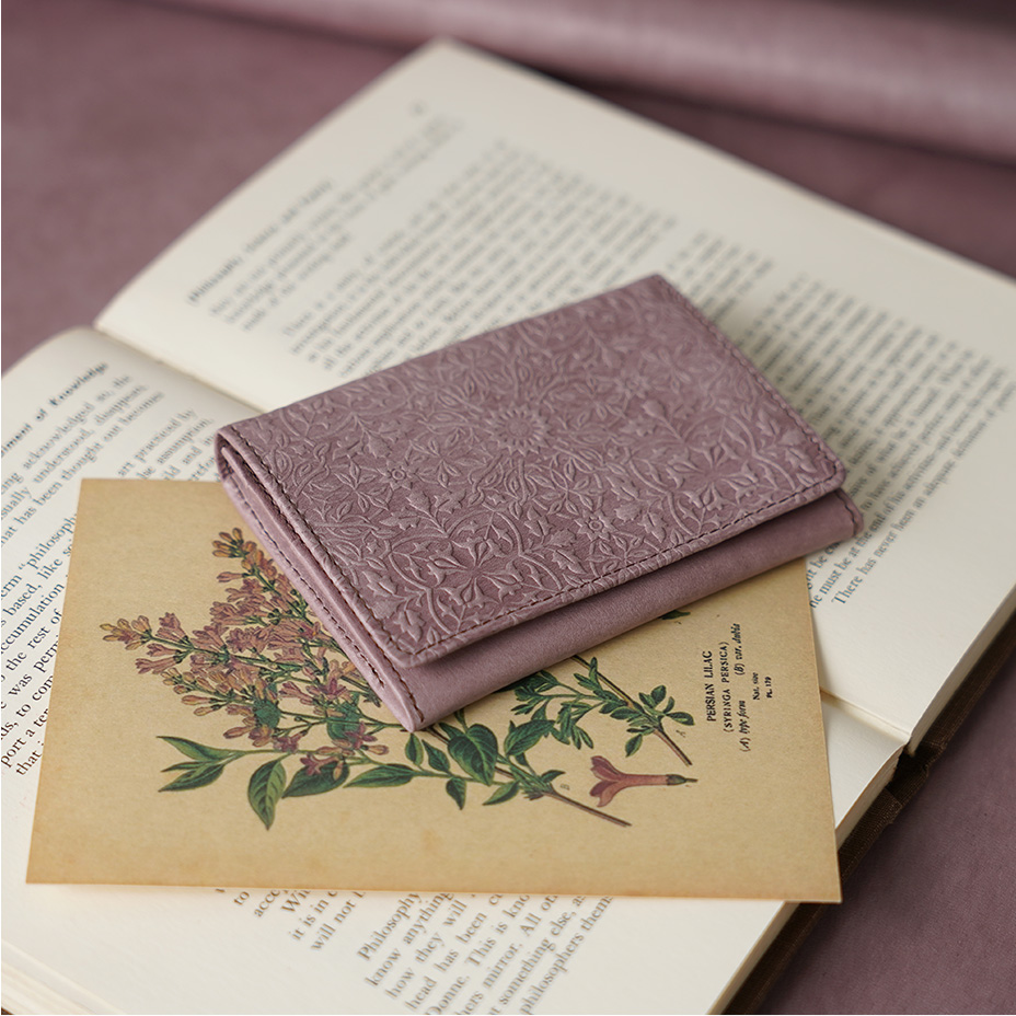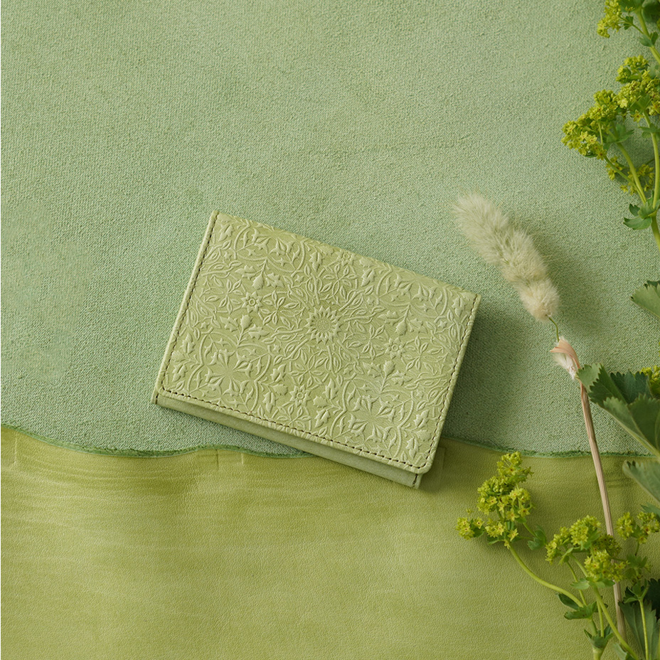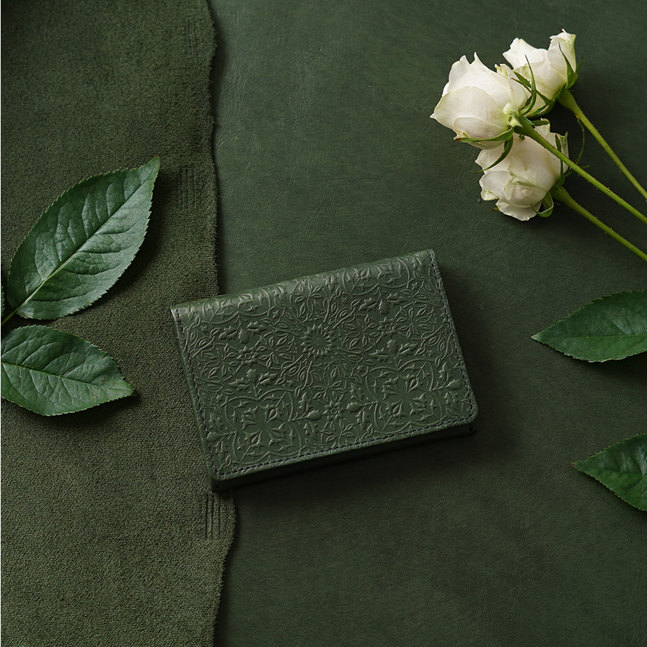 ウィリアム・モリスの美しい植物模様を革に型押しした、カードケース(名刺入れ)です。洗練されたモリスのデザインと、それを引き立てるスリムなフォルムが、新たな出会いのシーンを華やかに演出します。名刺入れとしてはもちろん、お財布に入りきらないサブカード類の収納ケースとしても、使い勝手の良いアイテムです。