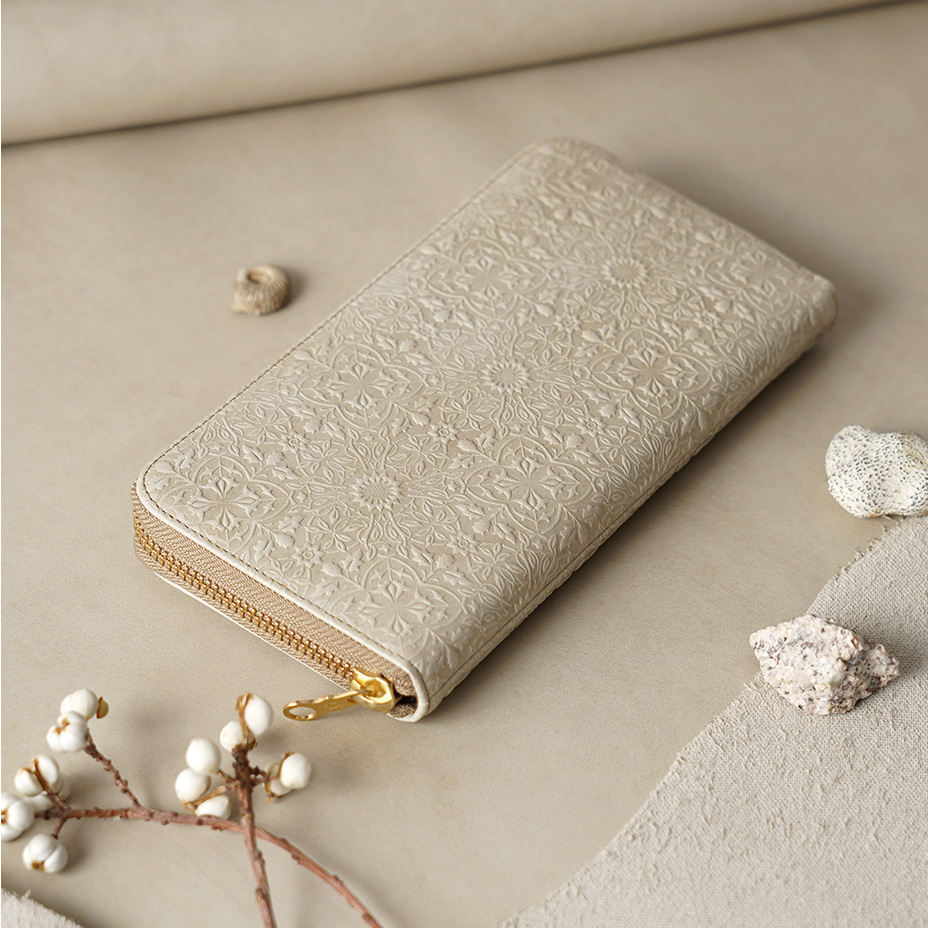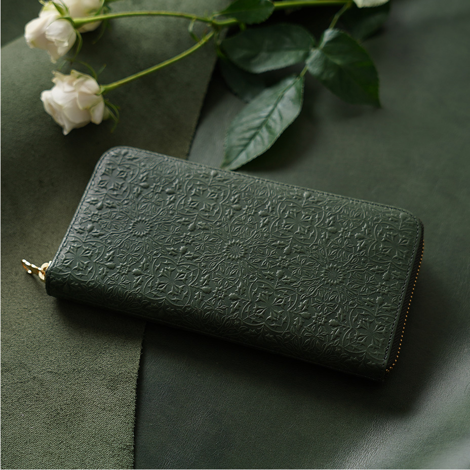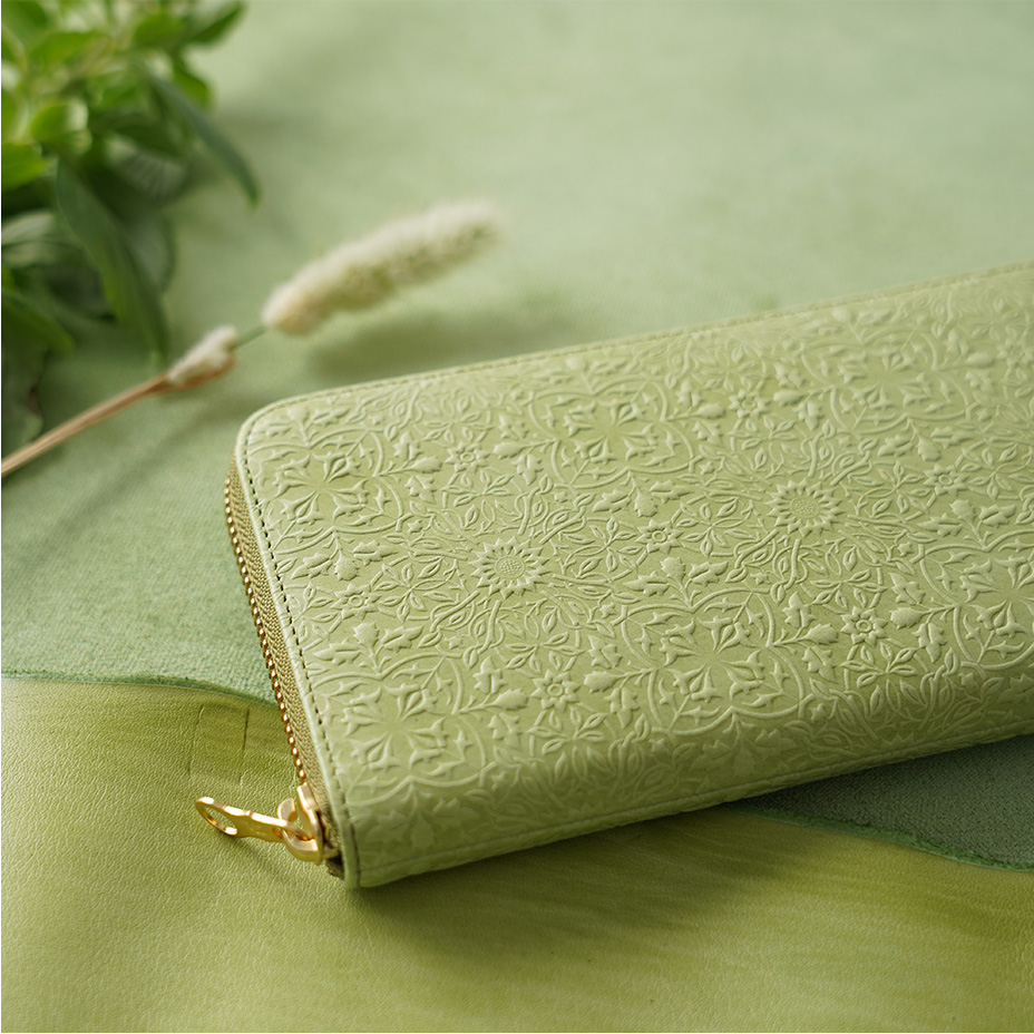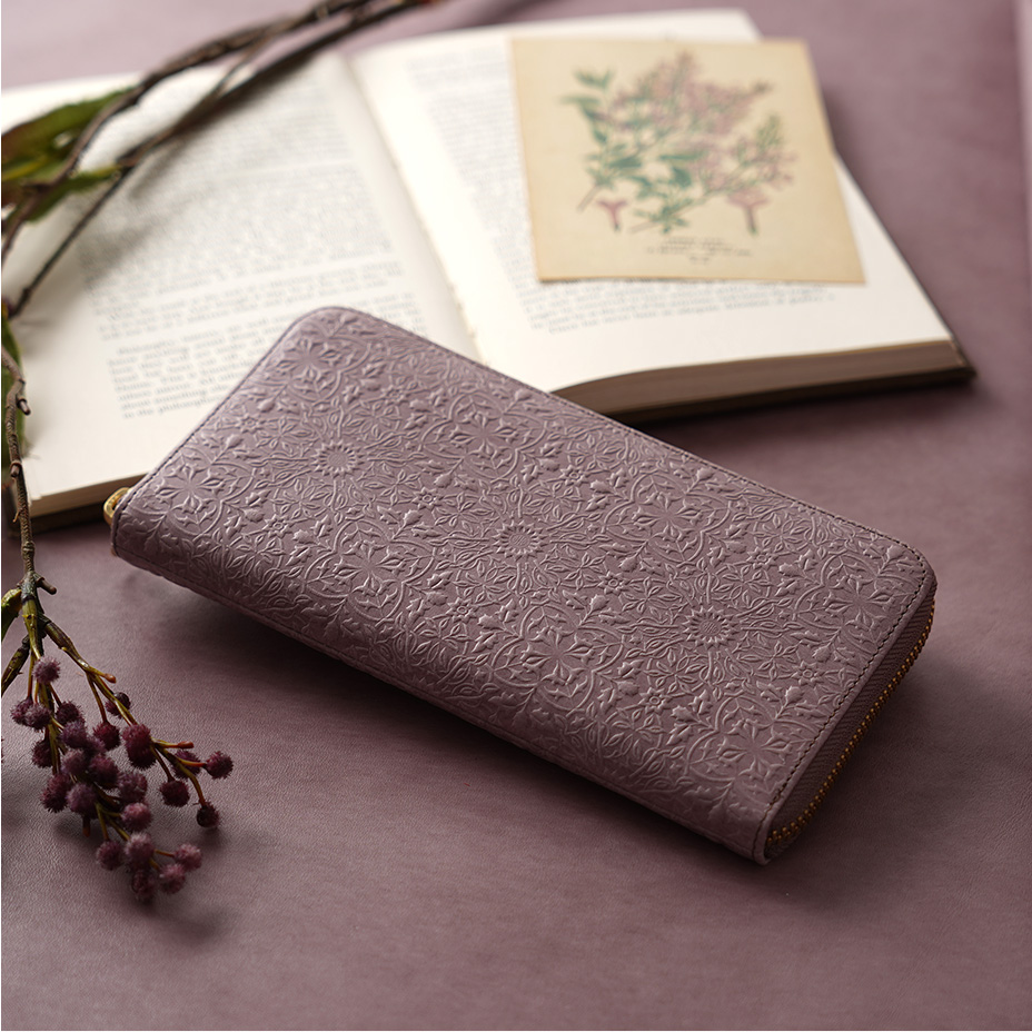 ウィリアム・モリスの美しい植物模様を革に型押しした、ラウンドファスナー長財布です。ファスナー開閉でお財布の口が大きく開き、中身のスムーズな出し入れが可能。仕分けポケットも充実しており、お札を折らずに綺麗に収納できるので、風水的にもおすすめ。大容量をすっきりと収納できるロングランのお財布です。