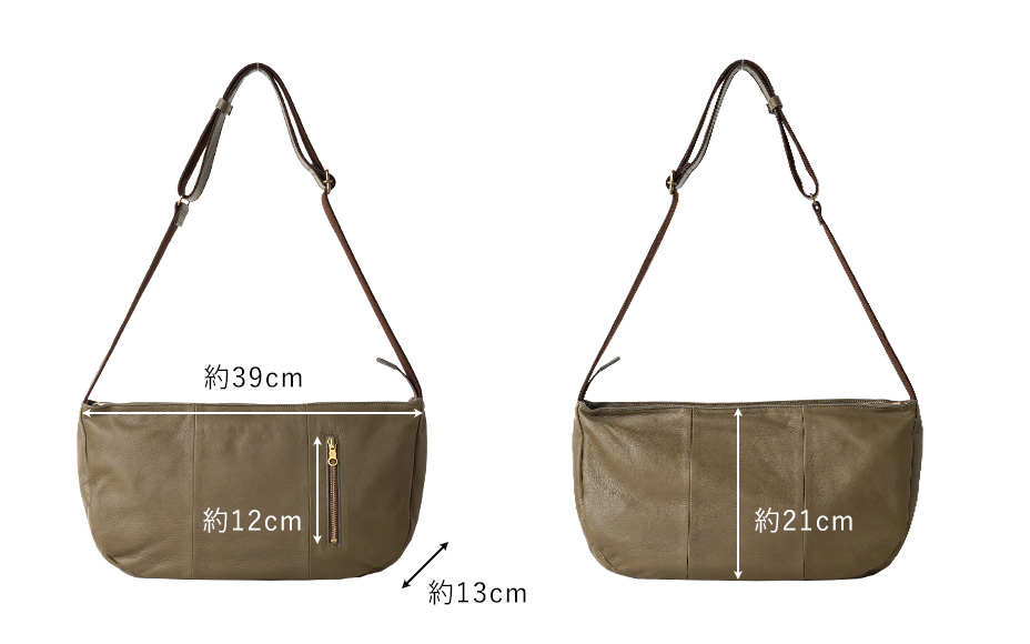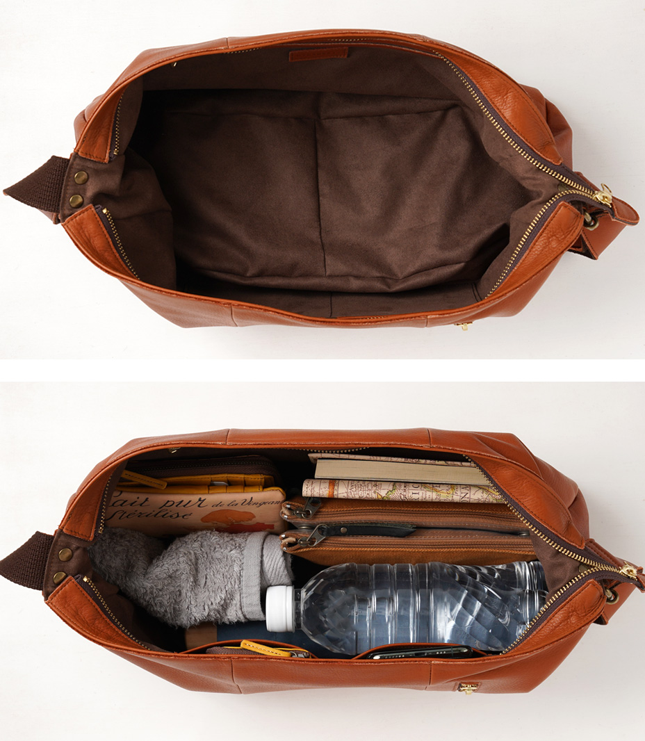 しなやかなレザーが荷物量に合わせてフォルムを変えるので、荷物が多くても少なくても身体にフィット。 お財布やポーチなどの必需品の他、ペットボトルや折りたたみ傘など、あると安心な物もゆとりを持って収納できます。口が大きく開いて中身も見やすいので、出し入れもスムーズ。13㎝の幅広マチで、嵩張る荷物もOK。