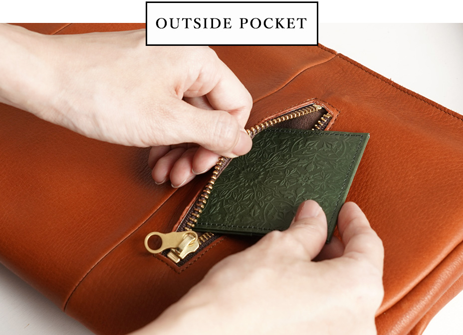 オイルドレザー×染料染の柔軟な手触りは、まるで長く大切に使われたヴィンテージバッグのよう。二度に渡って丁寧に革に油脂を加えた「二加脂仕上げ」による国産牛革を使用しており、使い始めから身体に心地よく馴染み、使うほどに革の繊維の奥から艶が湧き出るような経年変化も魅力です。