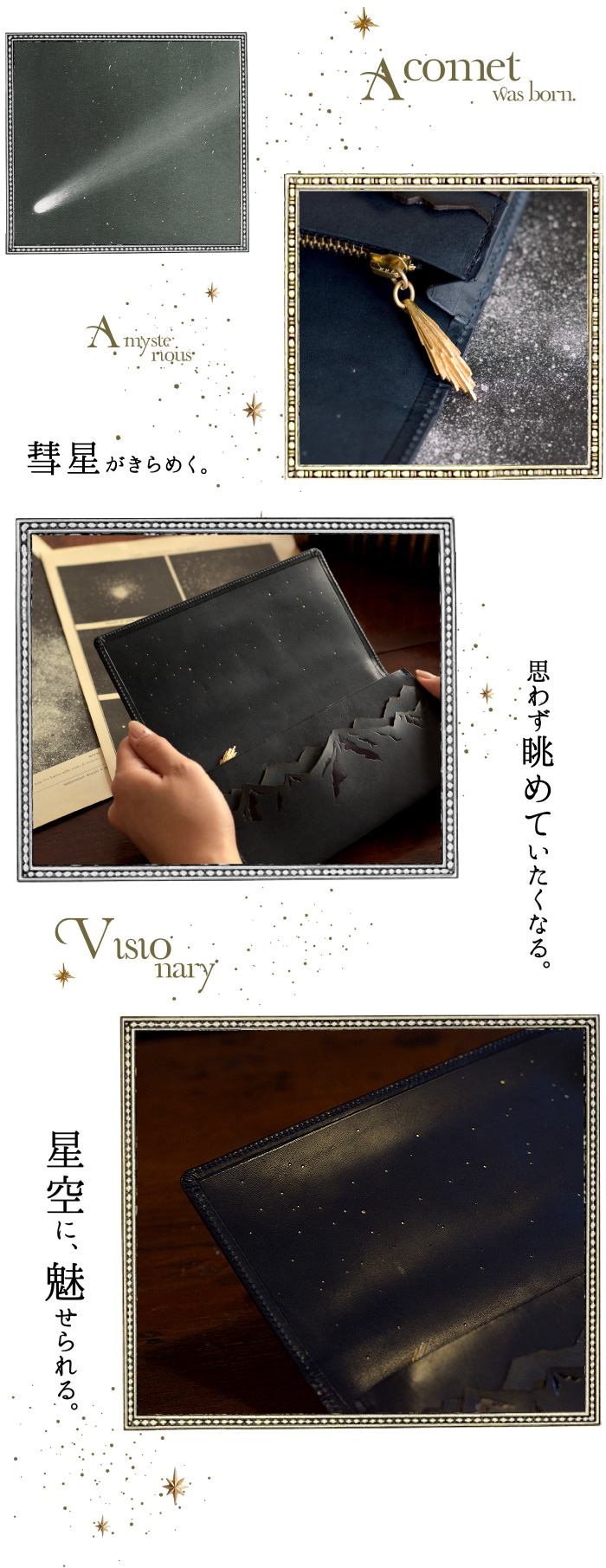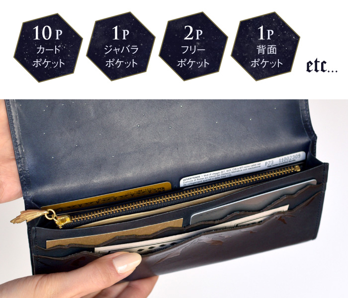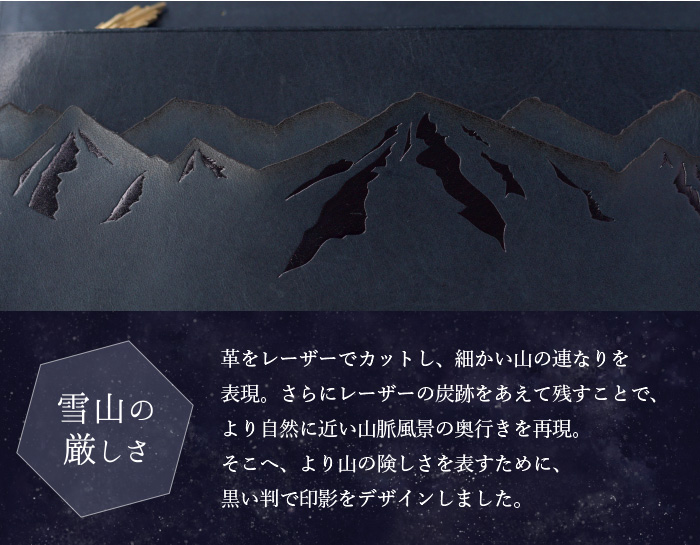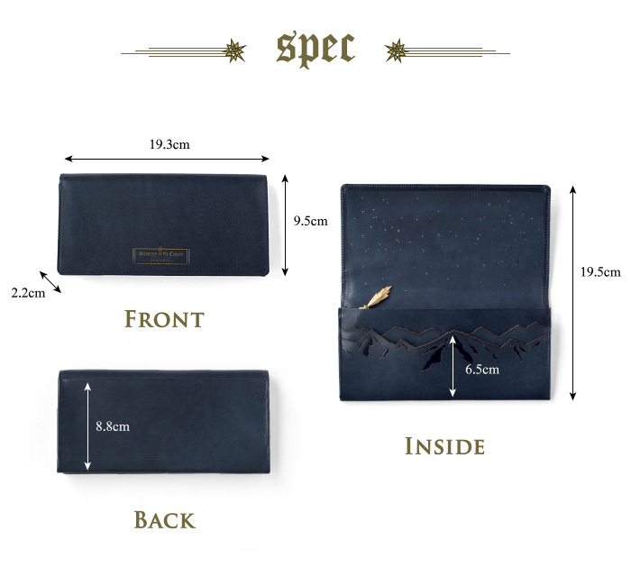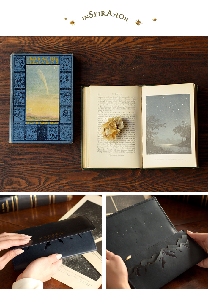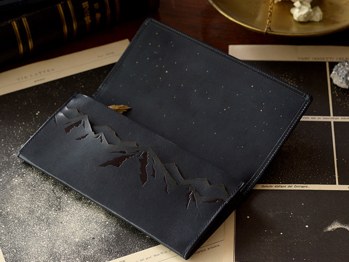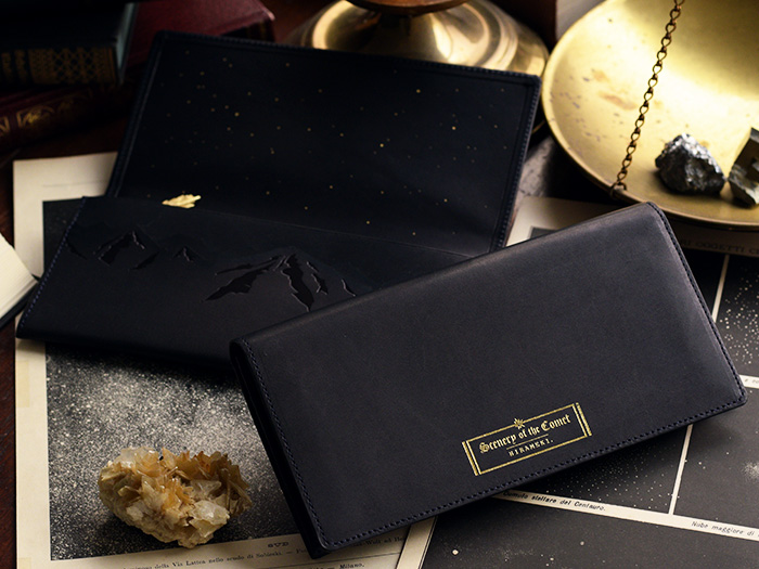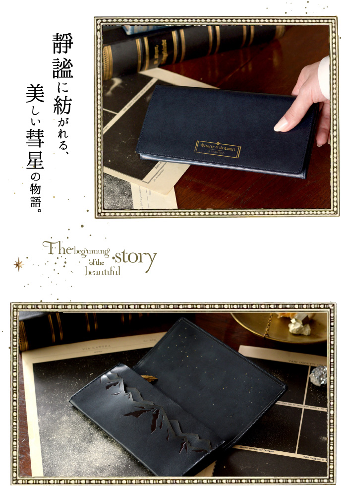 本の題名の様に、表に刻印された「Scenery of the comet」とは ”彗星のある風景”という意味。 お財布を開くとそこは、星が静かに瞬く静謐な世界。 険しいアルプス山脈の空に浮かぶ、大きな彗星が 美しい物語の始まりを予感させる、ロマン溢れるデザインです。