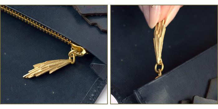強度を持たせる為、お財布の引手には真鍮素材を使用し、