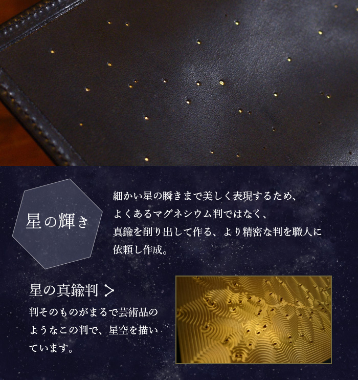 このお財布を初めて見た人は、「飛び出す絵本みたい!」と目を輝かせて くれます。彗星のある風景の趣を、様々なレザーの表現手法で追求した こだわりの絵画的表現をご紹介します。