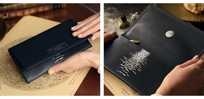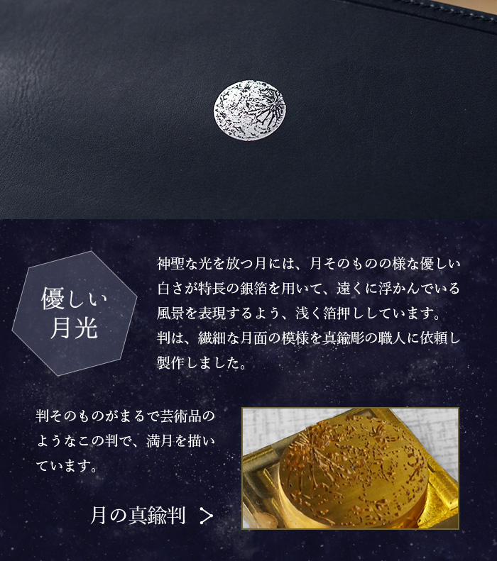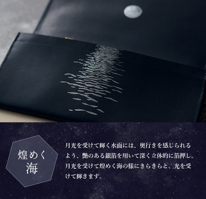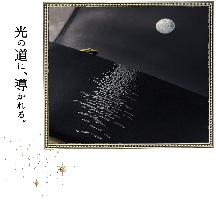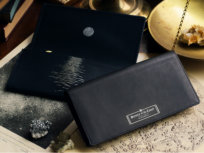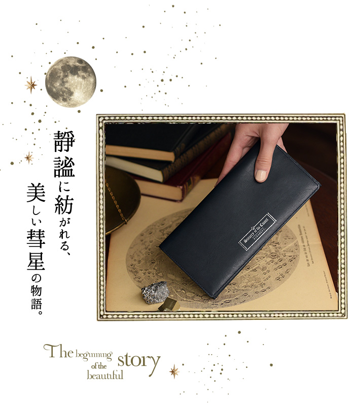 表に刻印された「Scenery of the comet」とは ”彗星のある風景”という意味。 お財布を開くと、そこには美しい満月が。 月光に照らされた海の水面が、月の道となって煌めいています。 そこに浮かぶ、大きなほうき星。 美しい物語の始まりを予感させる、ロマン溢れるデザインです。