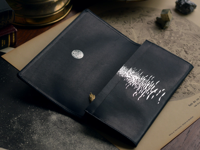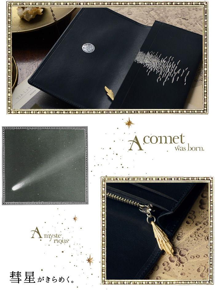 初めてこのお財布を開いた人は、そこから別世界が広がっている 印象を受けると思います。彗星のある風景の趣を 様々な表現手法で追求した、こだわりの絵画的表現をご紹介します。