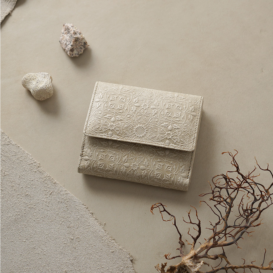HIRAMEKI.の新しいモリスシリーズは、一人の日本人職人が一枚一枚手塗りで濃淡を表現し、アンティークな風合いに仕上げた牛本革を使用しています。そこへ熱と圧力をかけて模様を型押しすることで、革に含まれるオイルや染料で自然な焼きムラが生まれ、一つとして同じものは無い、唯一無二の立体的な模様が浮かび上がります。