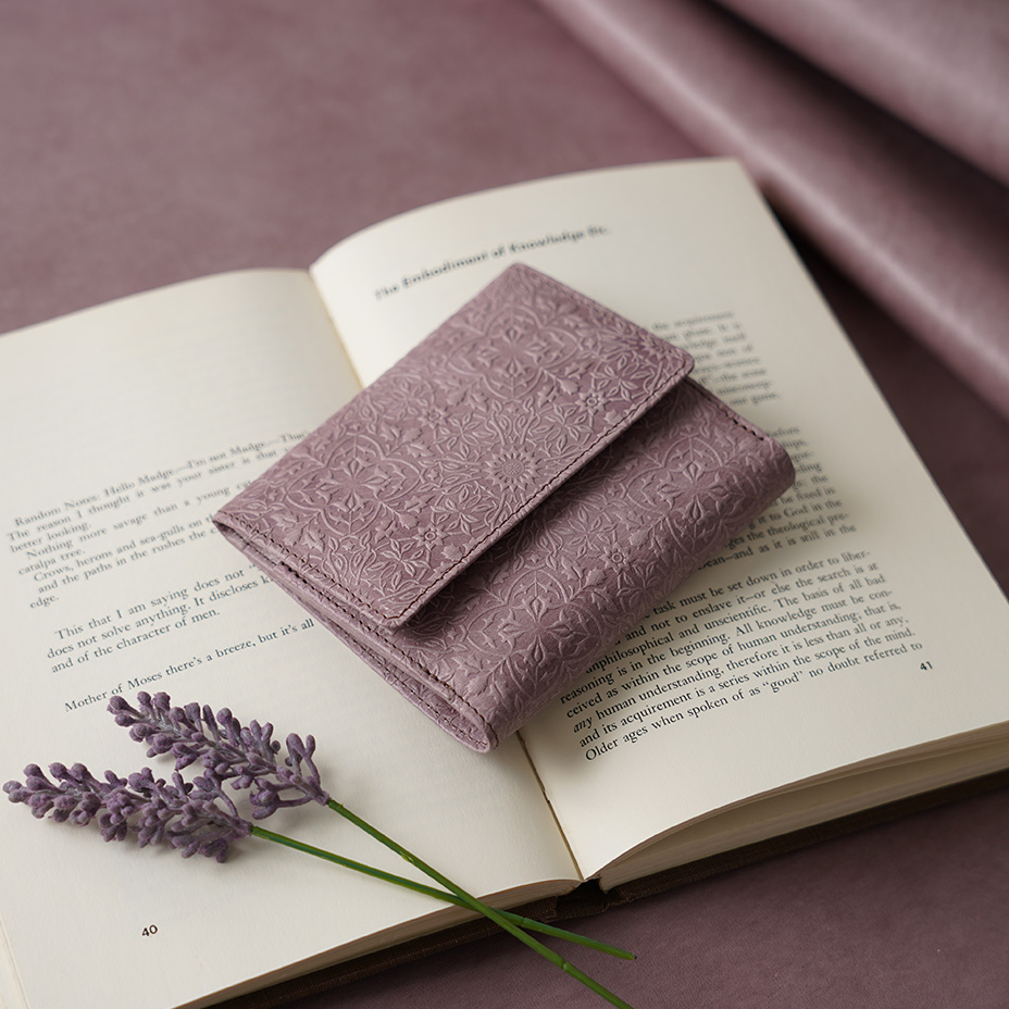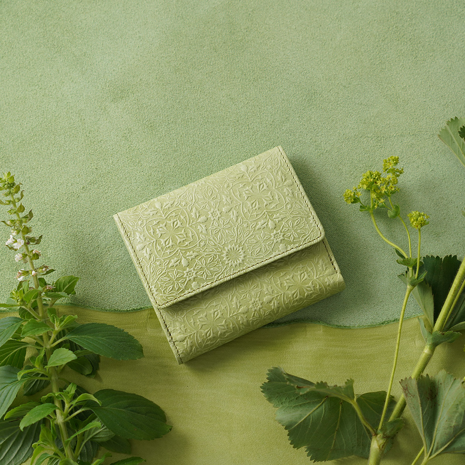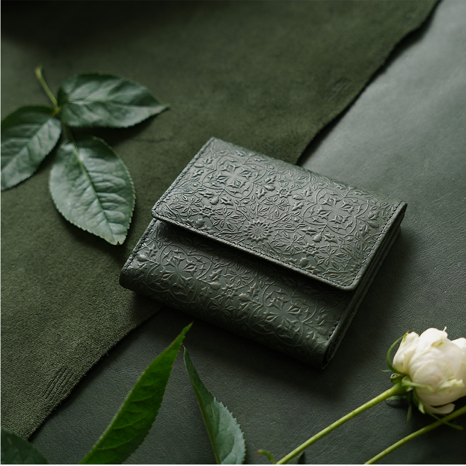 ウィリアム・モリスの美しい植物模様を革に型押しした、二つ折り財布です。手なじみの良いスタンダードなサイズ感に、メイン財布としてストレスなく使える十分な収納力も備えたバランスの良いお財布で、中でも大きく開くBOX型の小銭入れが使いやすいと好評をいただいています。