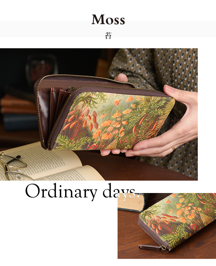 この作品は、ヘッケルの作品の中でも珍しく博物画でありながらムードのある作品で、湿度の高い森の奥深くに生える様々な形の蘚類たちが瑞々しく描かれています。使い込んでいくと、ヌメ革の経年変化によってよりアンティークな雰囲気をお楽しみいただけます。