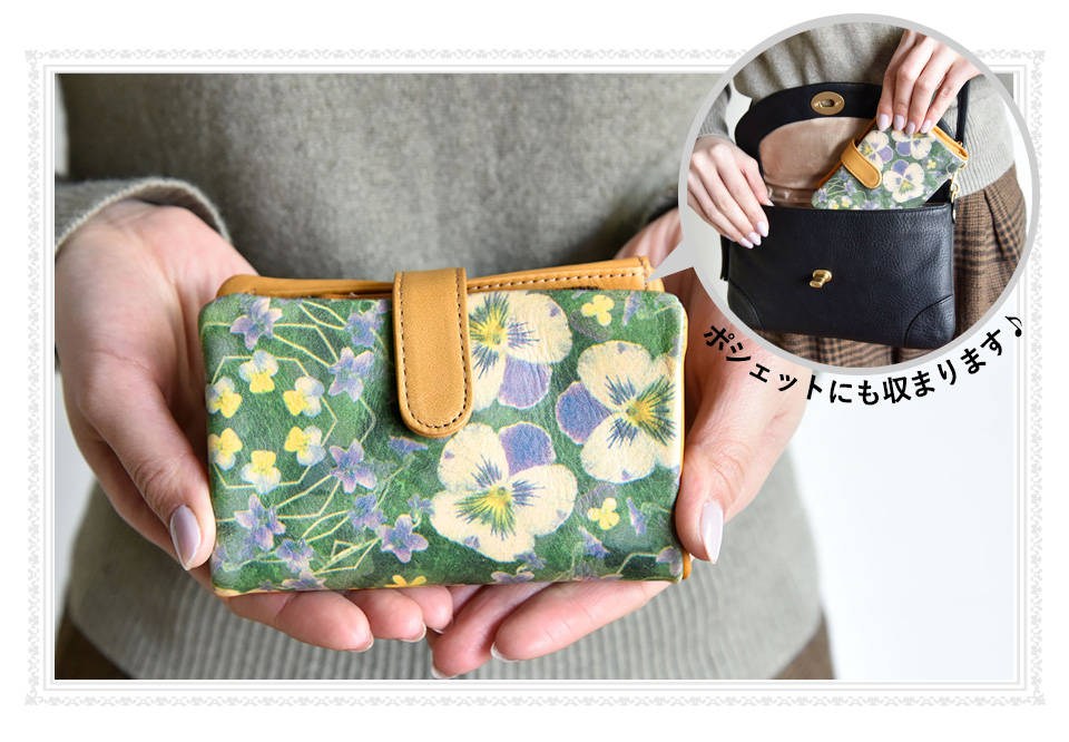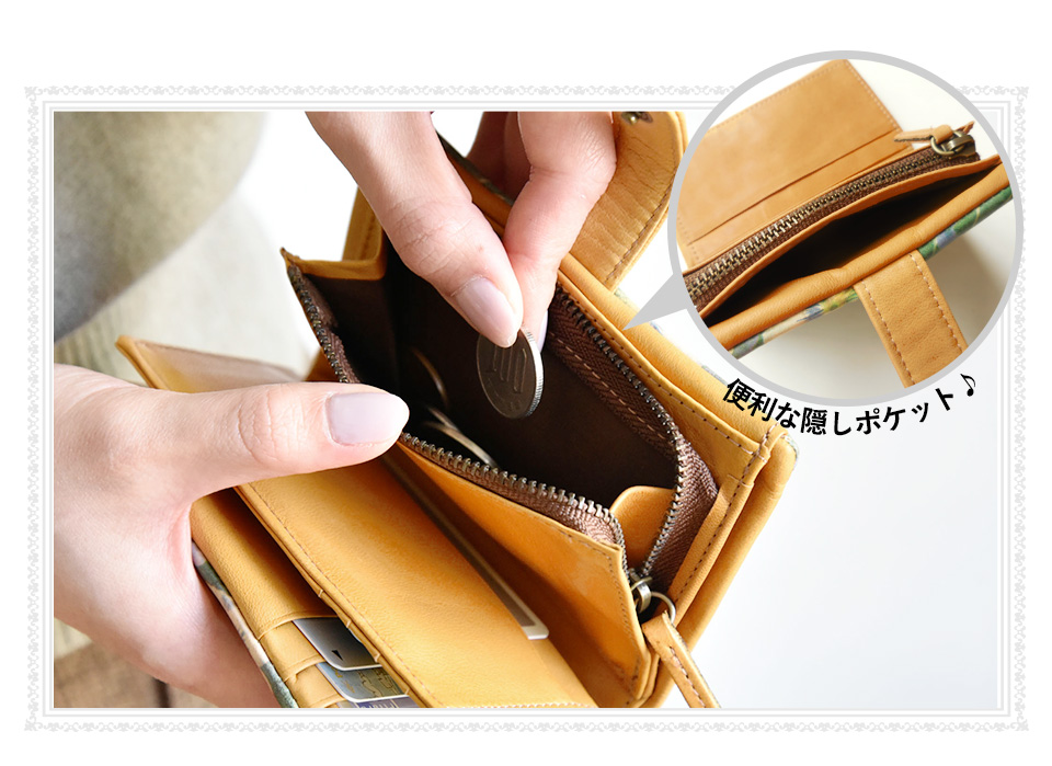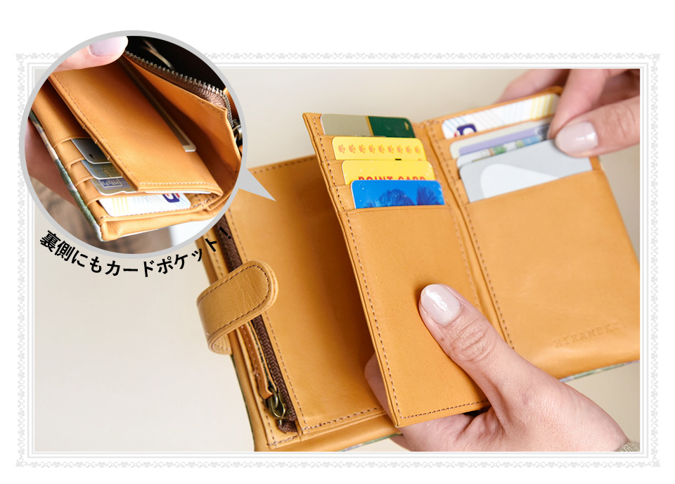 小柄な二つ折り財布のフォルムに、お札や小銭、カードが長財布並みにたくさん収納できます。