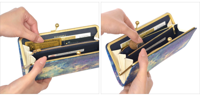 ガマグチの良いところは、口金をひねるだけの簡単な動作ひとつで、 楽に開閉ができること。お会計もスムーズに慌てることなく振舞うことができます。