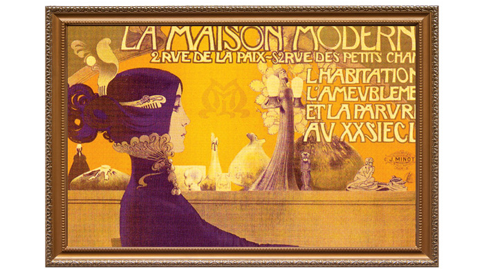 オラジはイタリア出身の挿絵画家で、この青いインクで描かれた「BLUE LADY」は、残された貴重な作品の一つ。絵の中にはガレやティファニーを連想する、ガラス作品が並べられ、大きな髪飾りと、華やかな首元のドレスを着た、美しい女性が印象的。この時代の流れであった、アール・ヌーヴォー様式を盛り込んだデザイン性の高い作品。