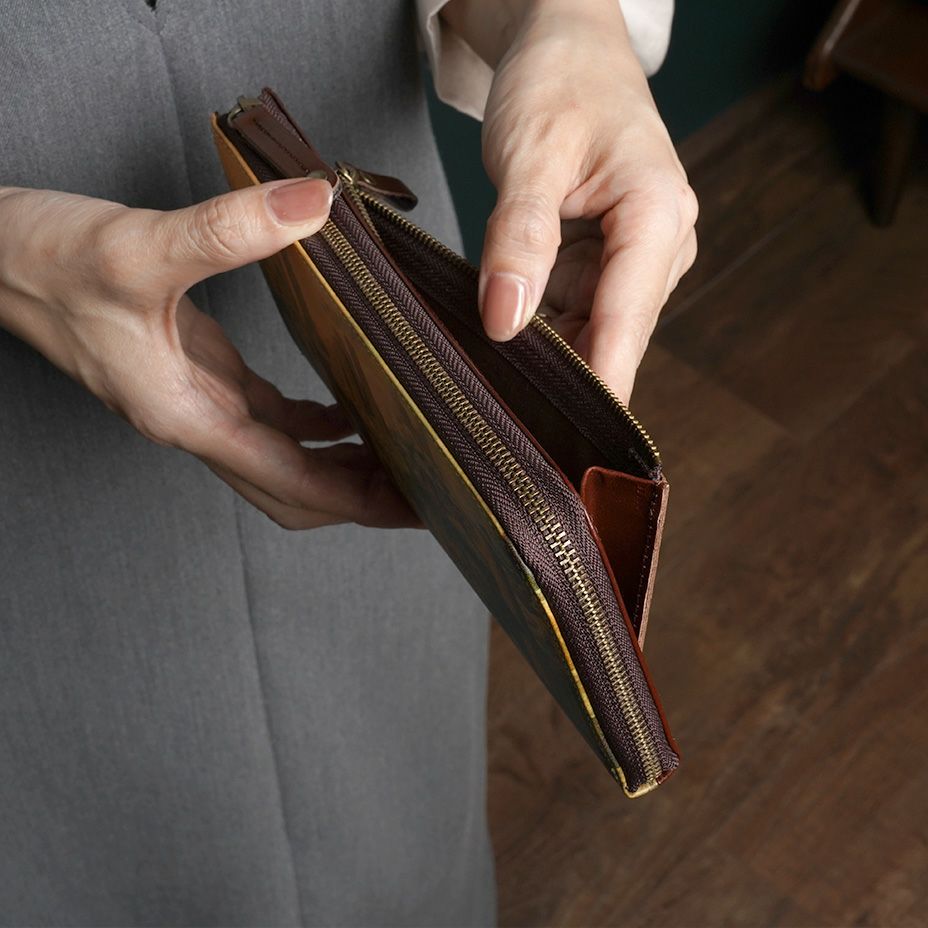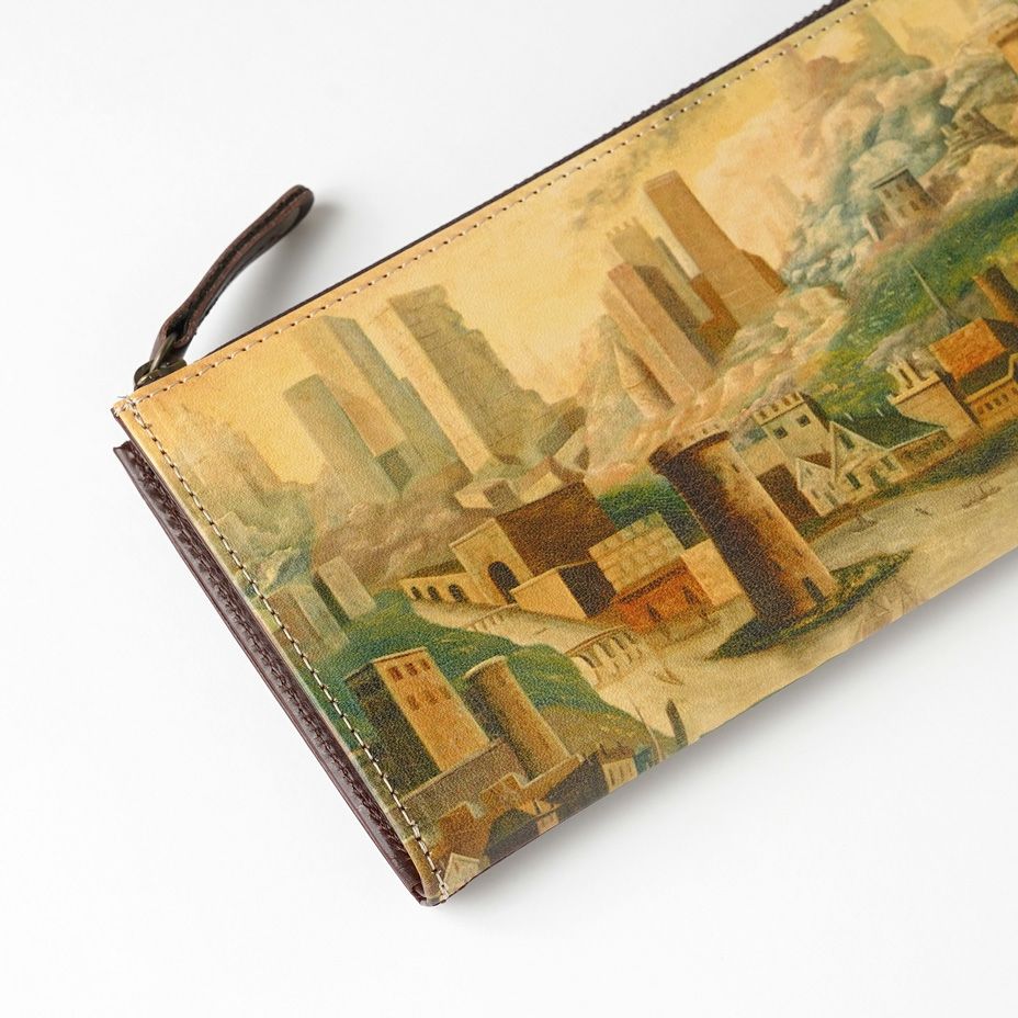 HIRAMEKI.で扱う個性豊かなアートは、絵のデザイン性だけでなく、アートを施す製品の形状や革の経年変化との相性をも考慮し 、デザイナー自ら製品への染色テストを繰り返して選考しています。目にするたびに胸が高鳴るような、心を豊かにするアートと出会えますように。