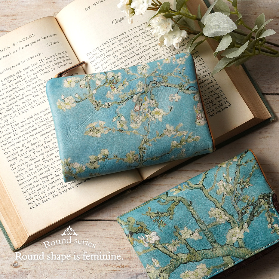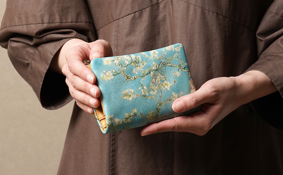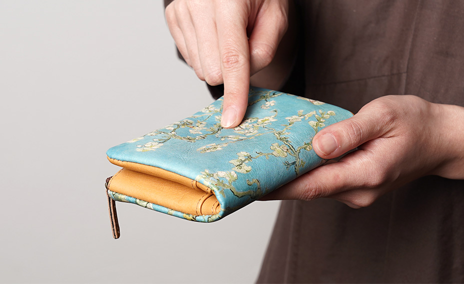 表面には、HIRAMEKI.が自社でお作りする、革本来の質感そのままに革へデザインを施した「アートレザー」を使用しています。ラウンドシリーズは、革や縫製で、手に持った時のやわらかさや、ずっと触れていたくなる質感にこだわってお作りしています。