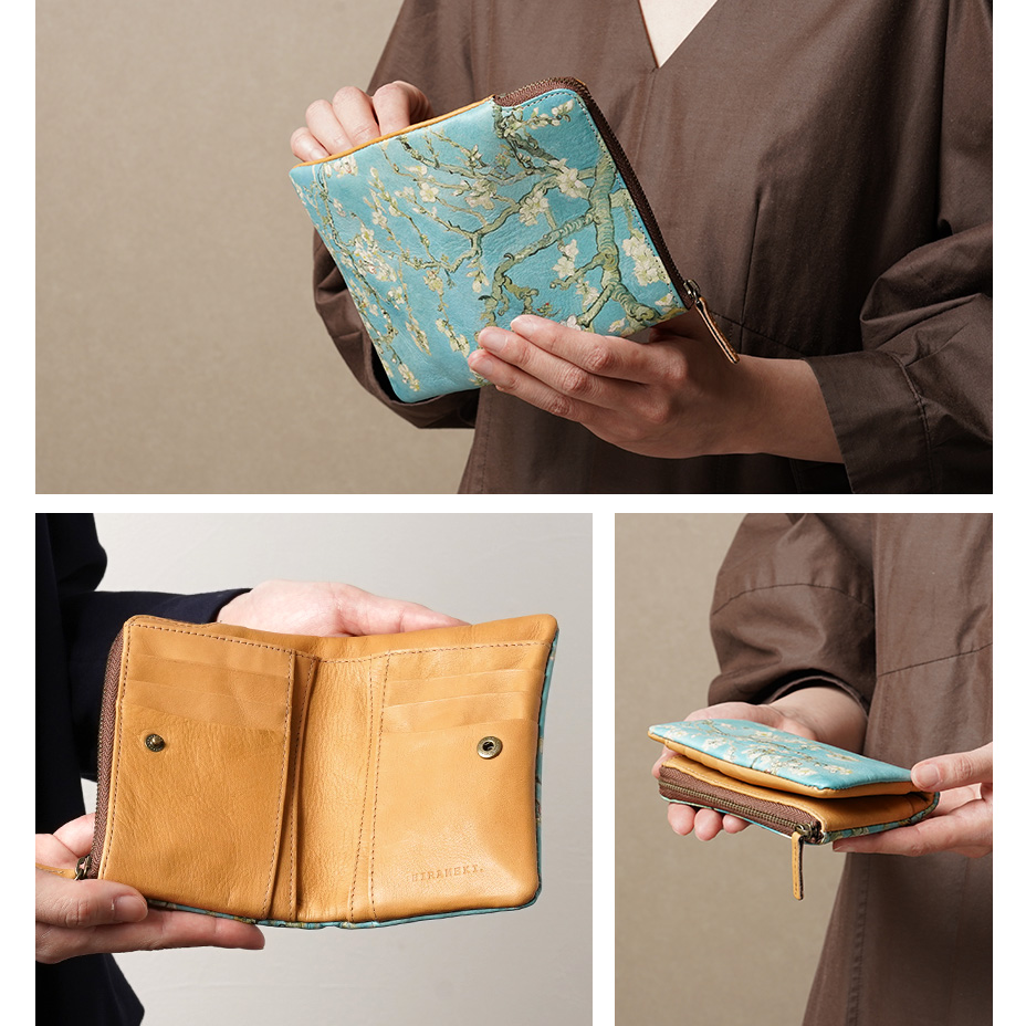 表から背面まで一枚革で仕立てたアートレザーの二つ折り財布。空気を包み込むようなやわらかな作りで手に馴染み、長財布並みの収納力と小銭の出し入れのしやすさを兼ね備えています。