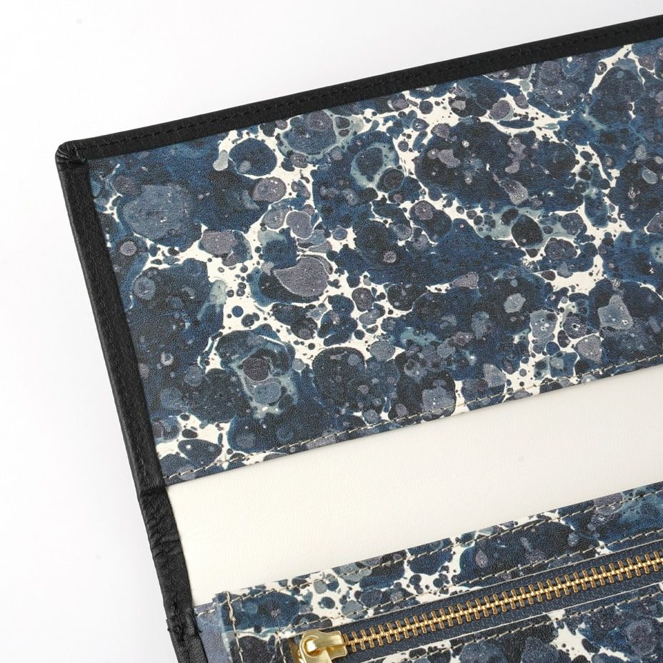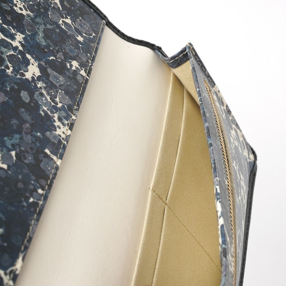 こちらのマーブル紙は、日本で製本業を40年以上営まれているアトリエで作成されたもので、Dutch(オランダ)と呼ばれる、水面に散らした絵具を間隔の違う2種の櫛を使って模様を描く伝統手法デザインの一つ。