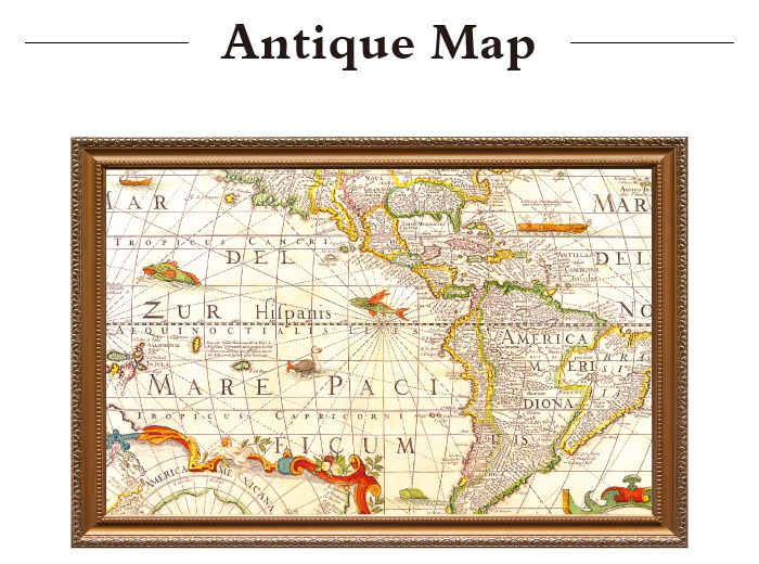 1950年代に描かれた太平洋と南アメリカをメインとした、世界地図。作者不明のアンティークな地図だが、デザイン性が高く、地図の中には、伝説の生き物など、動物も描かれ、面白みのあるものとなっている。