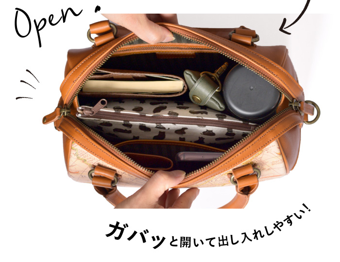 大きく開く口とたっぷりのマチ、コロンとした丸いフォルムで、収納力抜群!