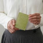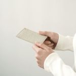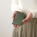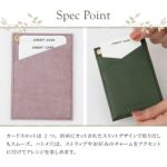 2つのカードスロットを備えており、斜めにカットされたスリットデザインで取り出しもスムーズ。ハトメ穴には、別売りのレザーストラップを使ってバッグにつないだり、お好みのチャームをアクセントに付けてアレンジを楽しめます。※内側にはスエード調の手触りの良い生地を使用。色は表のカラーに合わせてコーディネイトしています。