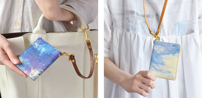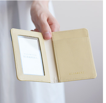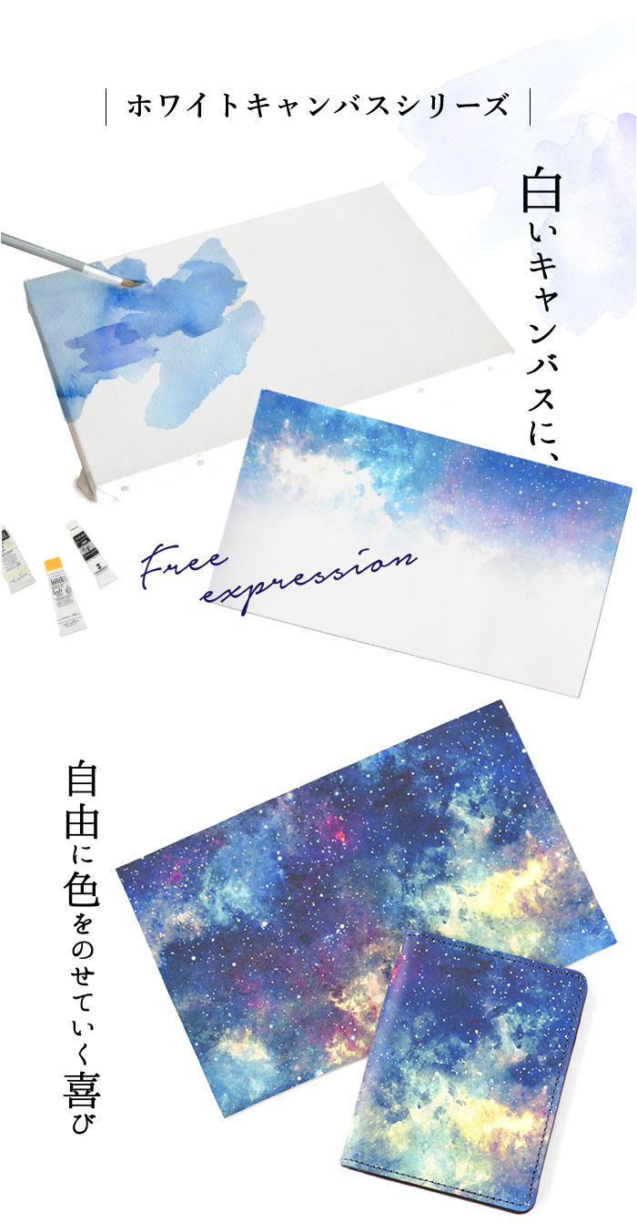 HIRAMEKI.別注の白革を下地としたホワイトキャンバスシリーズは、 本革ならではのサラッとした素肌感を残しながらも、 独自の加工で経年による色合いの変化を極限まで抑えました。 それにより、白革に施したアート本来の美しい色彩を長く保つことができ、 初めて手に取った瞬間のときめきを、より長くお楽しみいただけます。
