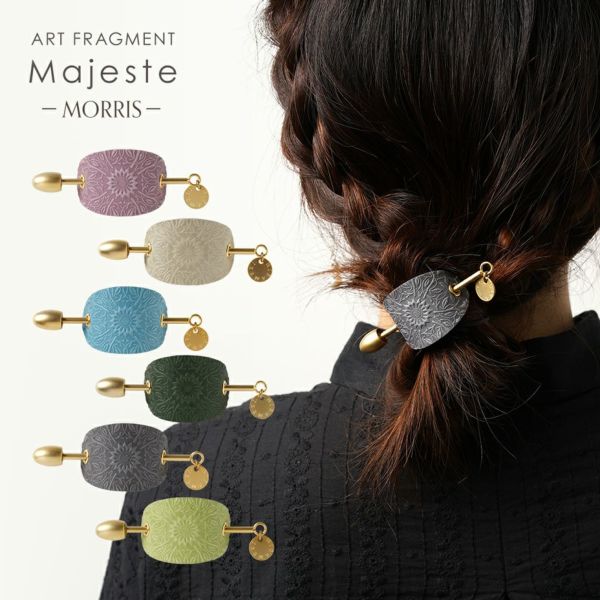 ・アイテム / マジェステ(ヘアアクセサリー) ・シリーズ / アートフラグメント ・サイズ / サイズ / H:約3cm W:約8cm D:約2.5cm ・重さ / 約14g ・素材 / 牛革、真鍮 ・生産国 / 日本 ・機能 / シリコンキャップ式
