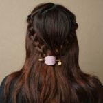 ②結び目の上からレザーパーツを被せ、ゴムの上部の髪にスティックを挿す。(POINT:最初に片側の穴にスティックを挿した状態で被せるとスムーズに装着できます)