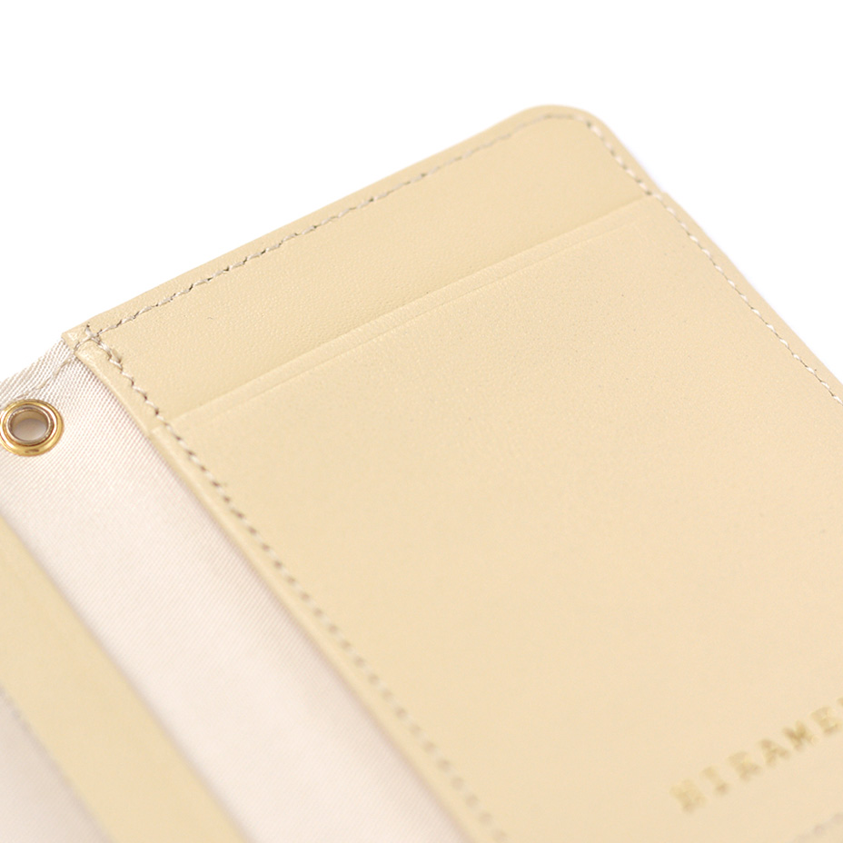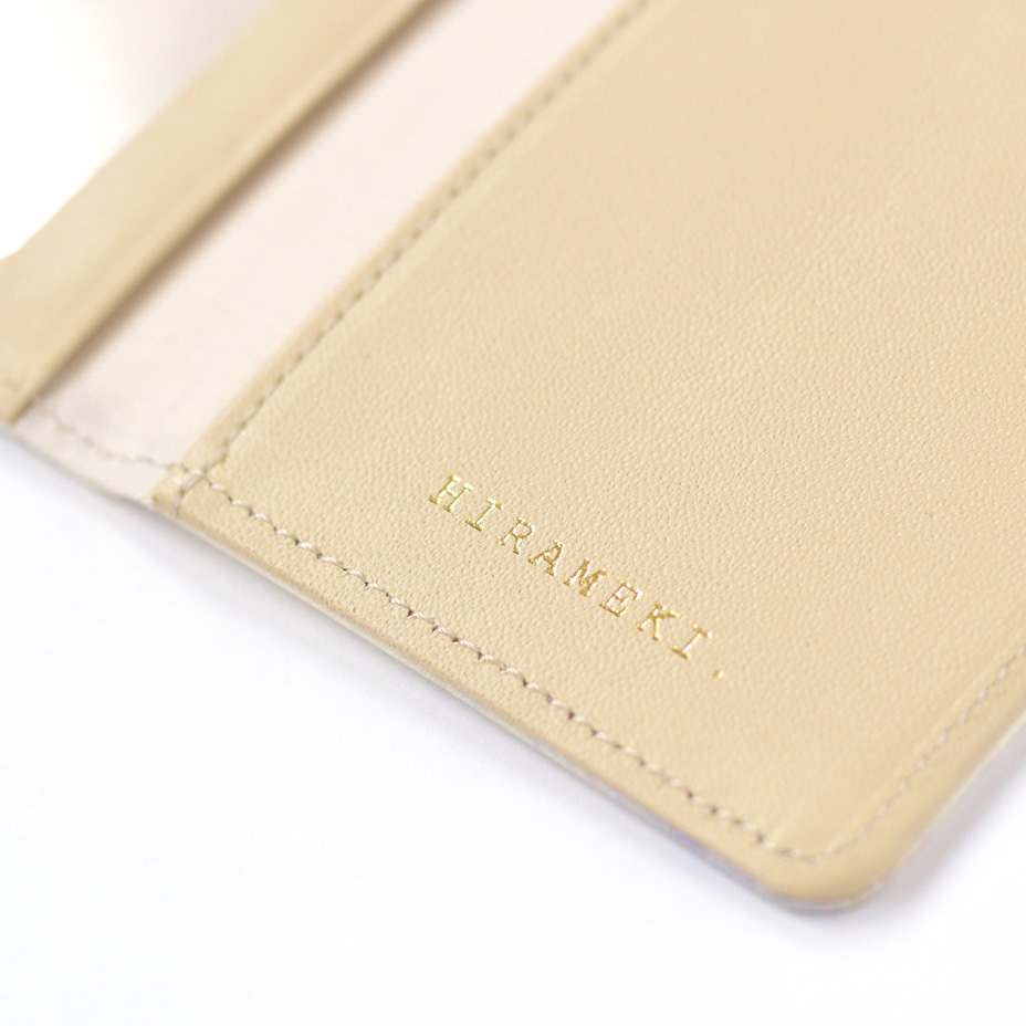HIRAMEKI.別注の白革を下地としたホワイトキャンバスシリーズは、本革ならではのサラッとした素肌感を残しながらも、独自の加工で経年による色合いの変化を極限まで抑えました。それにより、白革に施したアート本来の美しい色彩を長く保つことができ、初めて手に取った瞬間のときめきを、より長くお楽しみいただけます。