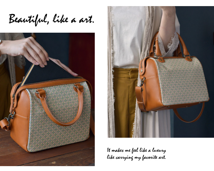本革に直接デザインを染色したこちらのバッグシリーズは、 お気に入りのアートを持ち歩いているような贅沢な気分に。 良質な牛革を全面に使用しているので、デザインだけでなく 革のナチュラルさと、上質な革の質感も魅力。 斜め掛け・肩掛け・手持ちの3wayでスタイルを 変えることが出来ます。