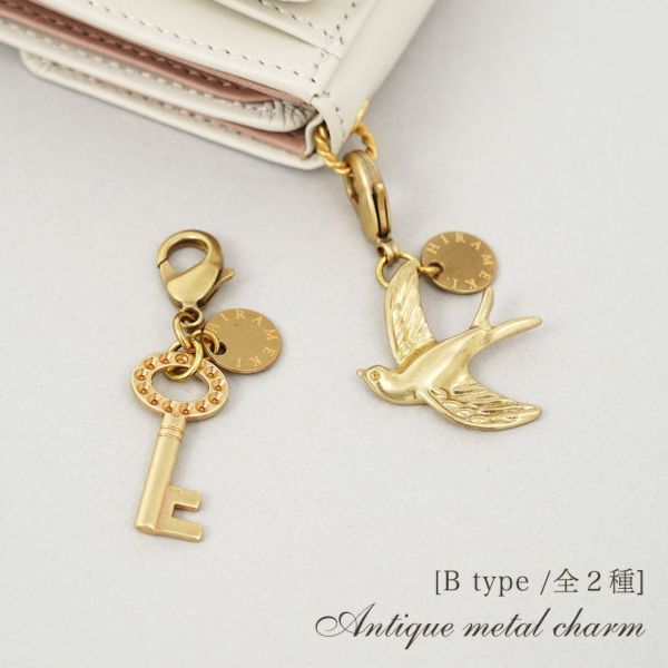 アンティーク風のデザインで、思わずコレクションしたくなるような愛らしさのチャーム。上品なゴールドの色合いで、可愛くなりすぎず大人っぽい印象を与えてくれます。 バッグやお財布、ポーチなどの引き手に付けたり、シンプルなアイテムに添えるだけで、ぐっと華やぐアイテムです。