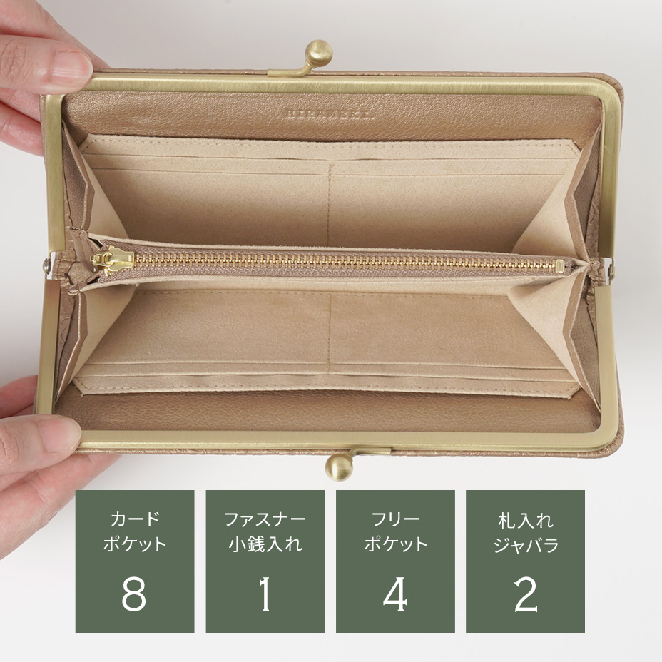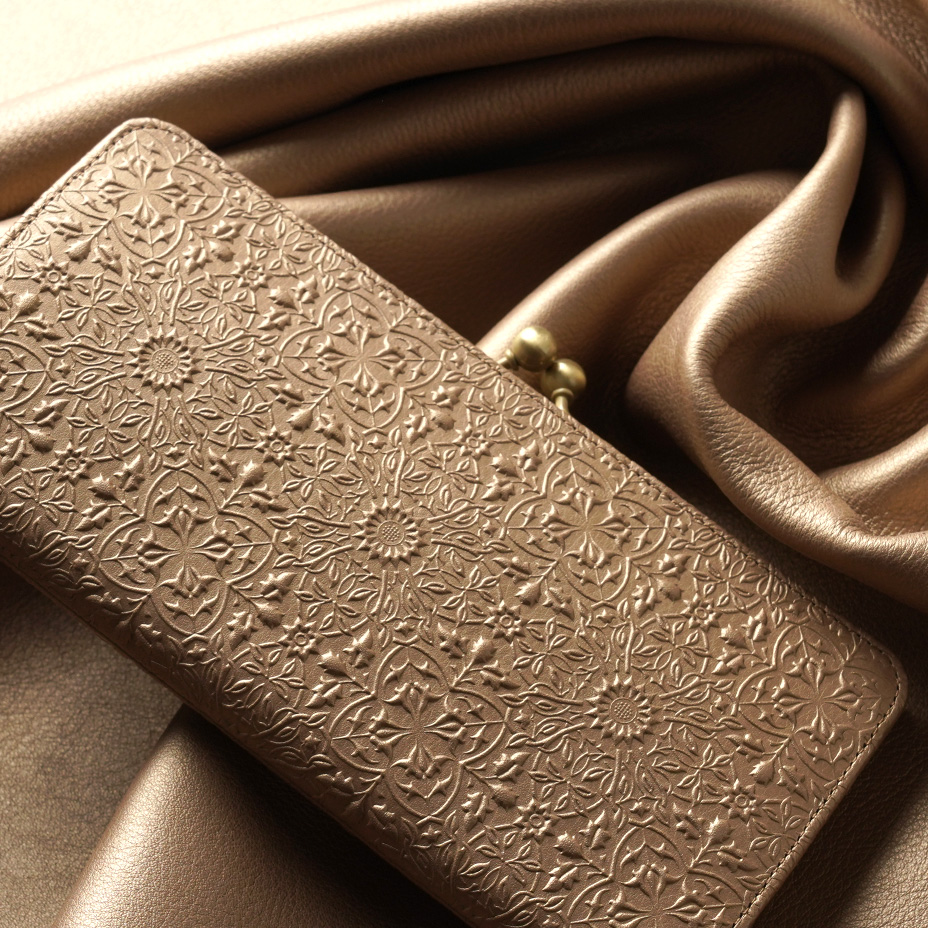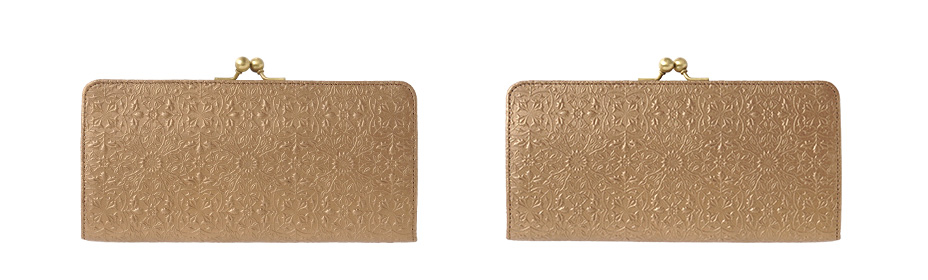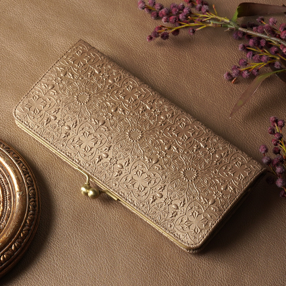 ウィリアム・モリスの美しい植物模様を、上品に輝くメタリックレザーに型押しした薄型ガマグチ長財布です。スリムで洗練されたフォルムに、口金をひねるだけのスマートな開閉。一度使うと離れられない快適な使い心地が特長です。
