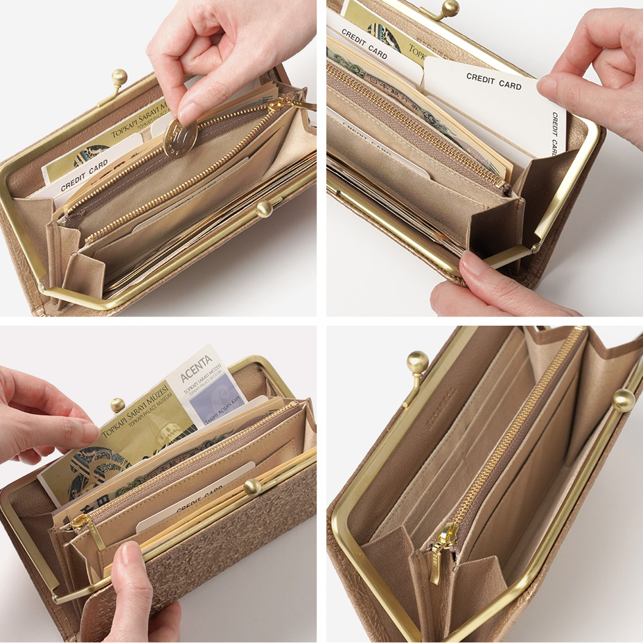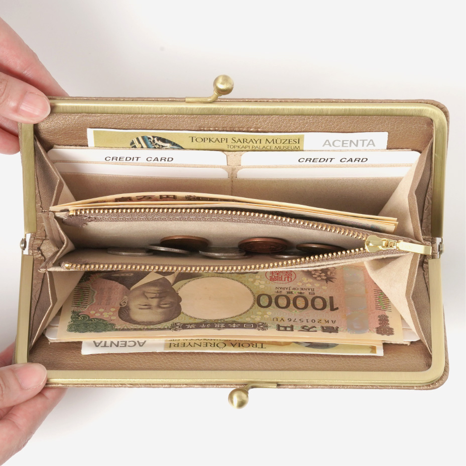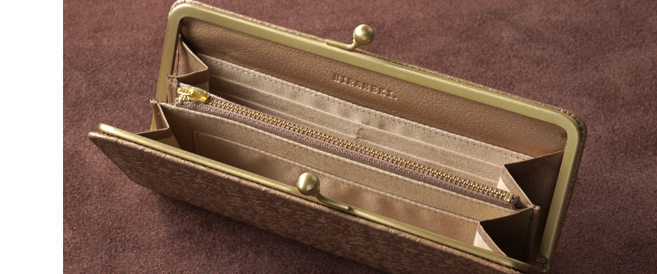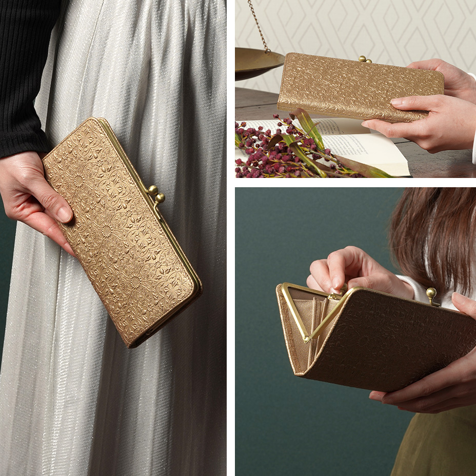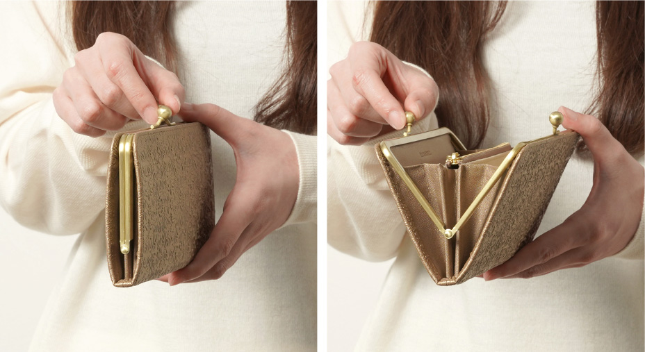 ワンタッチ開閉の使い勝手のよさはガマグチ最大の魅力。スリムに仕立てられたデザインは女性の手でも持ちやすく、見た目にもスマートな印象に。