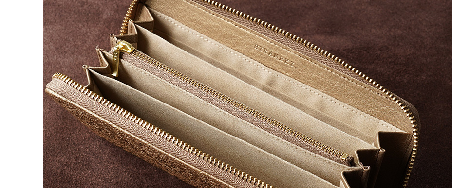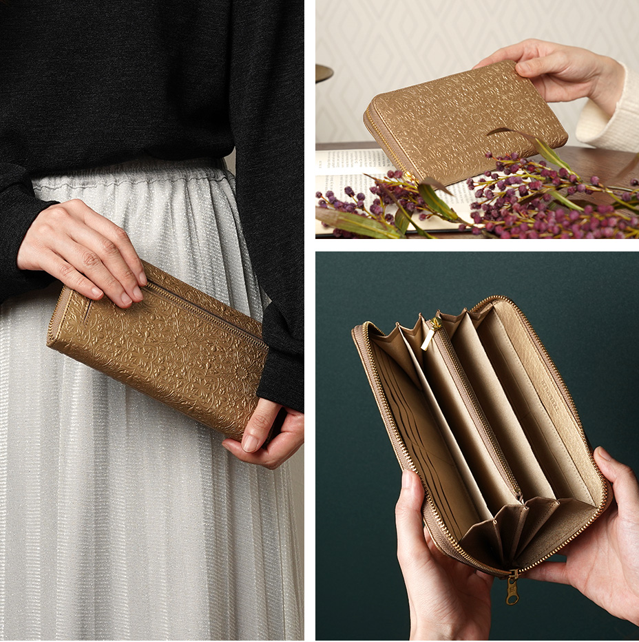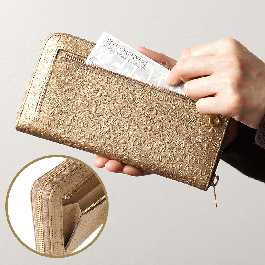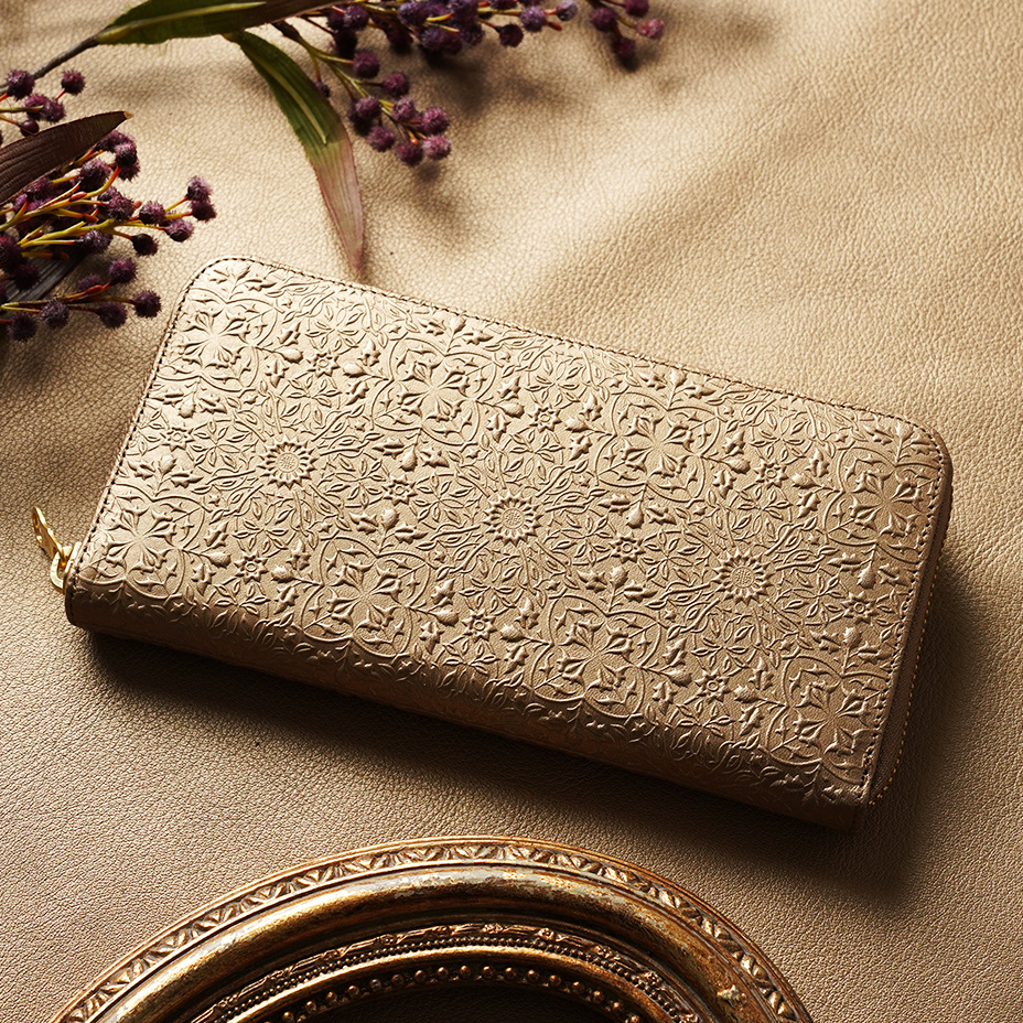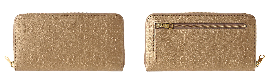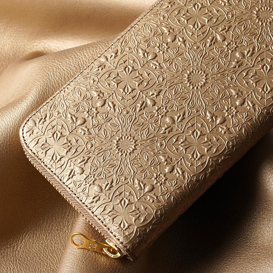 ウィリアム・モリスの美しい植物模様を革に型押しした、上品な輝きを持つメタリックカラーの長財布です。ラウンドファスナータイプの内装は左右対称で使いやすく、ポケットも充実しており、大容量をすっきりと収納できます。