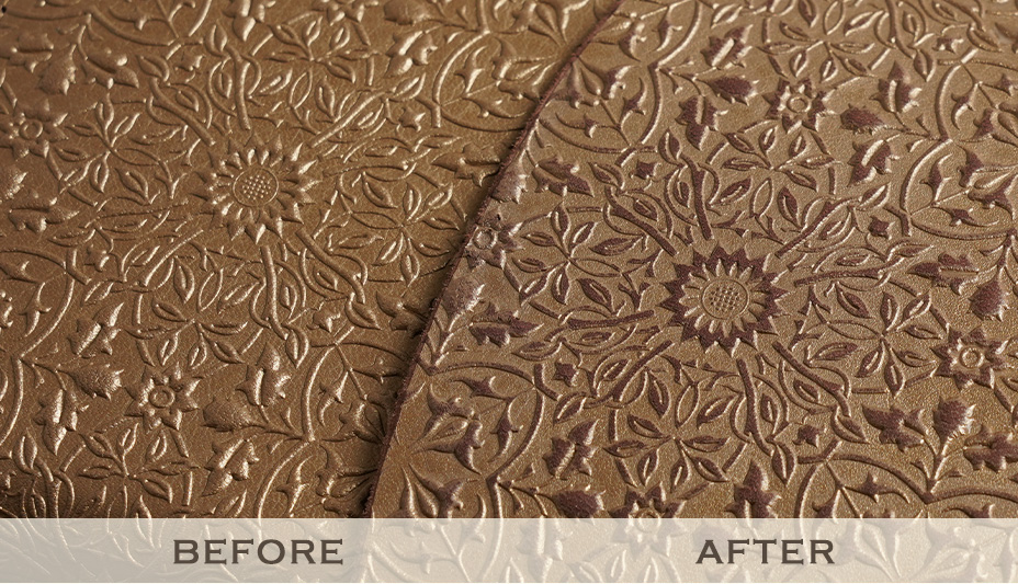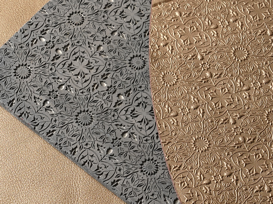 美しい植物模様は、モリスのデザインを描き起こして作った特注の金属版を使って施します。革に熱と圧力を加え、一枚ずつ丁寧に型を押していきます。