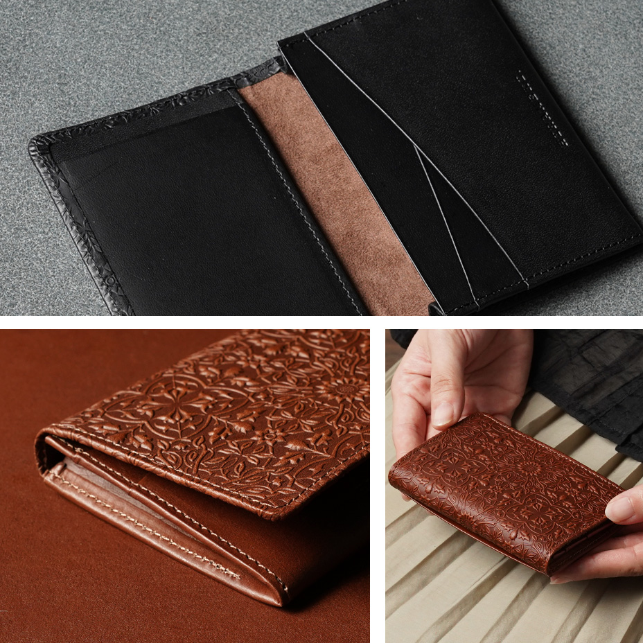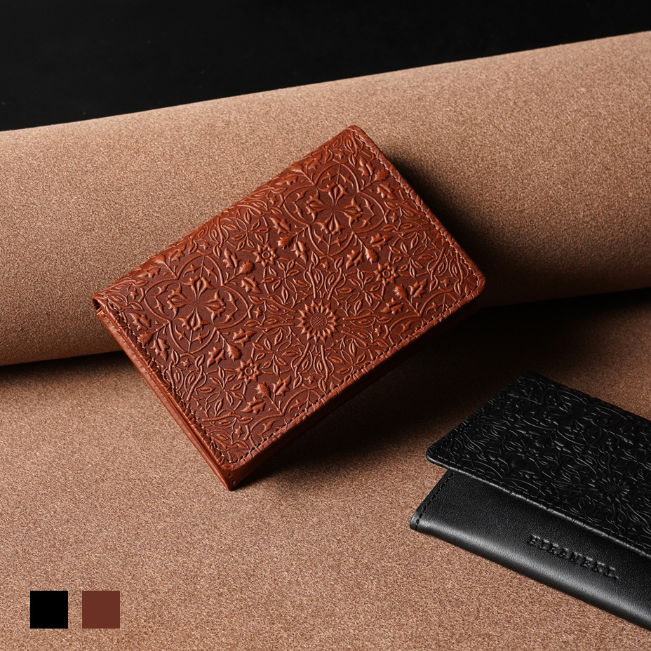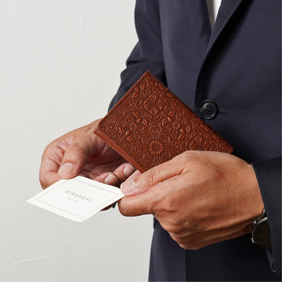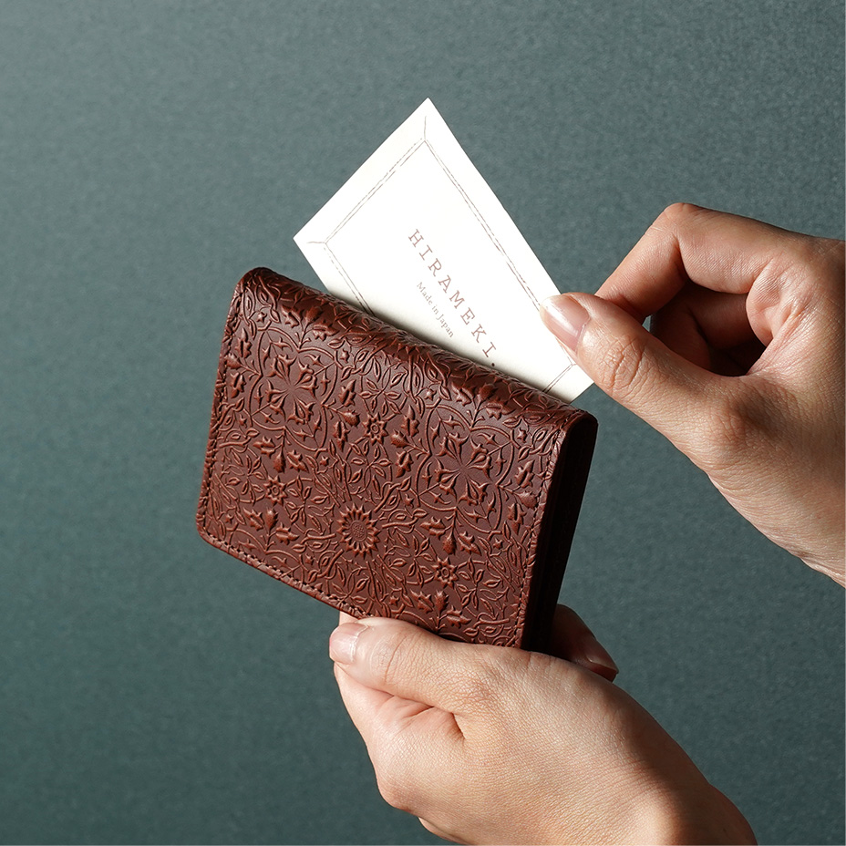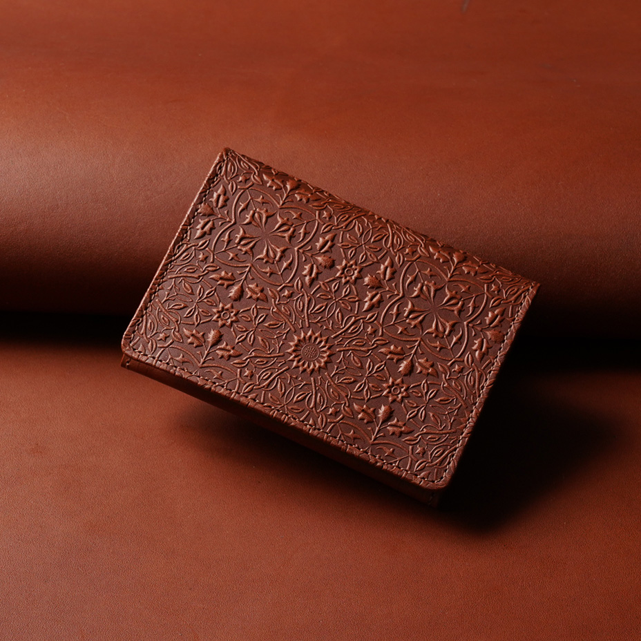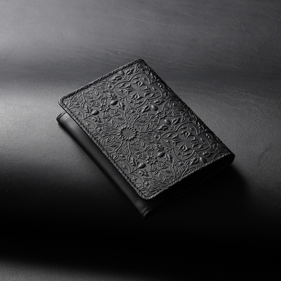 ウィリアム・モリスの装飾的なデザインが美しい、カードケース。使うほどに味わい深く育つ牛革に、特注の金属版で立体模様を施した、趣あるシリーズです。
