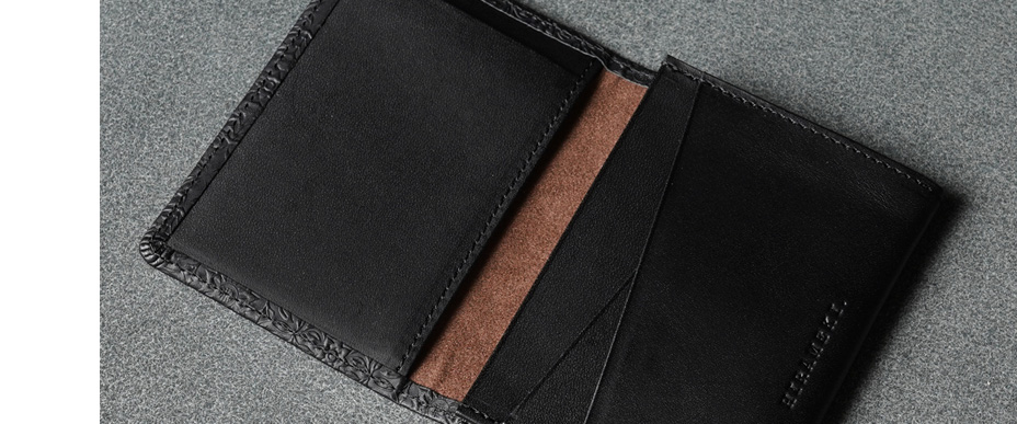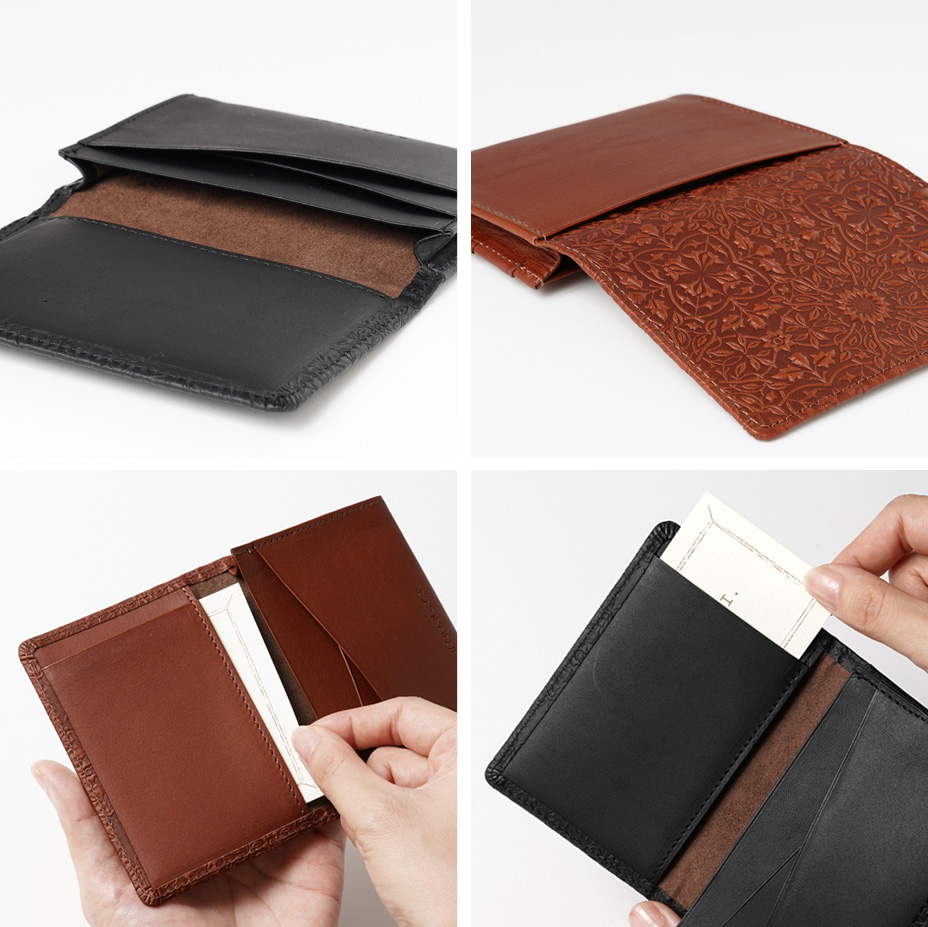 スマートな見た目で、メインポケットには30~40枚の名刺を収納。内側に4つのカードスロット、背面に1つのカードポケットを備え、ICカードやクレジットカードの仕分け収納にも便利。