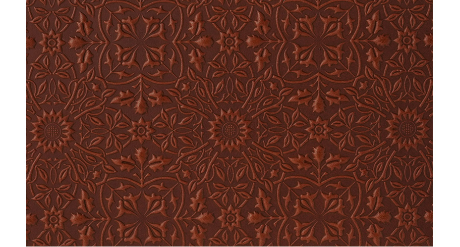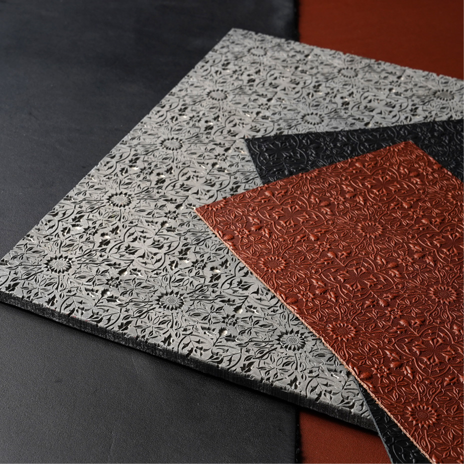この繊細な立体模様は、モリスのデザインを描き起こして作った特注の金属版を使って施します。革に熱と圧力を加え、パーツ毎に一枚ずつ、丁寧に型を押していきます。