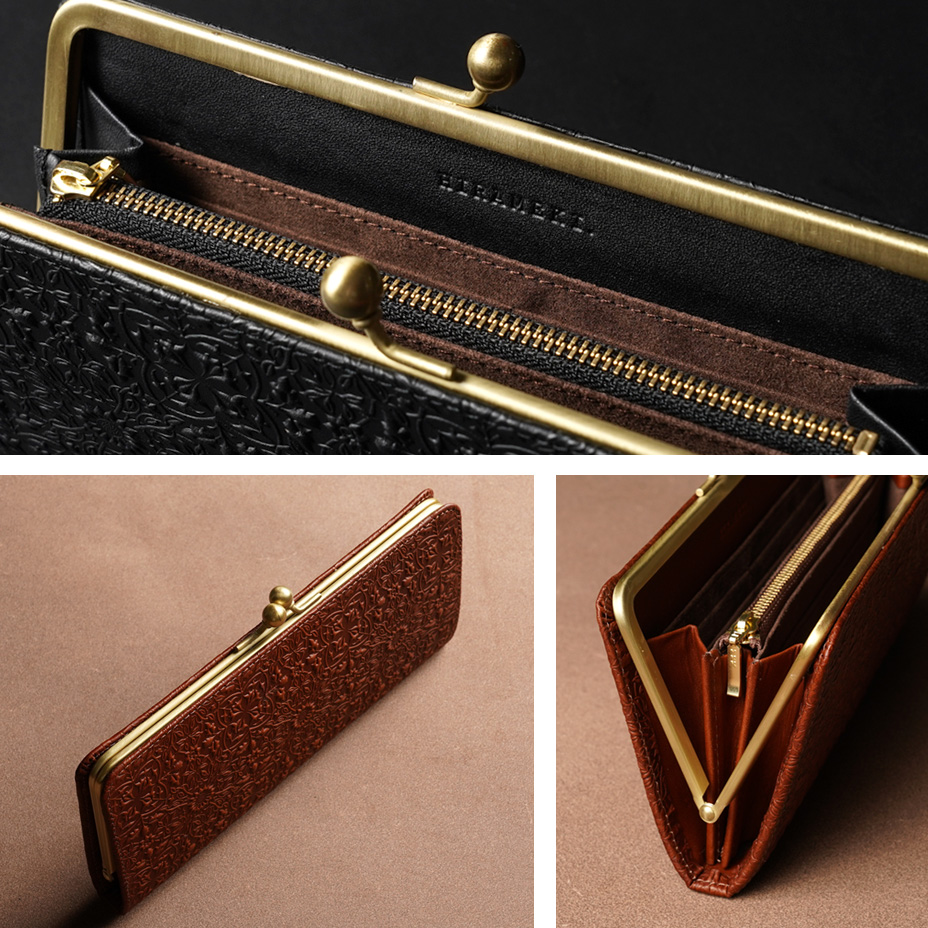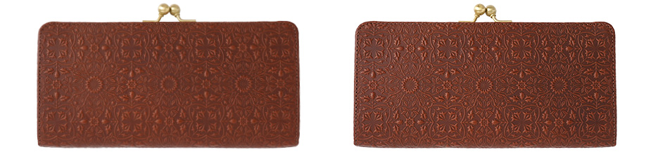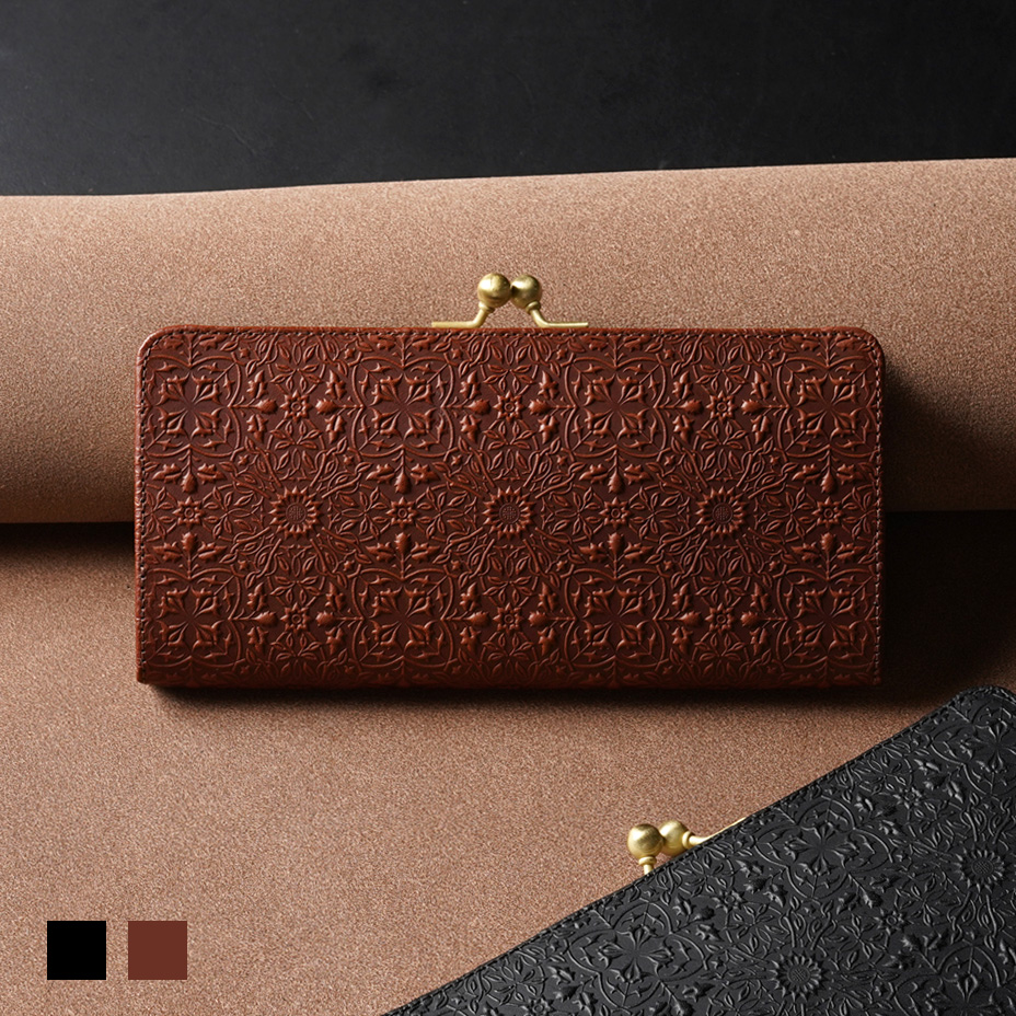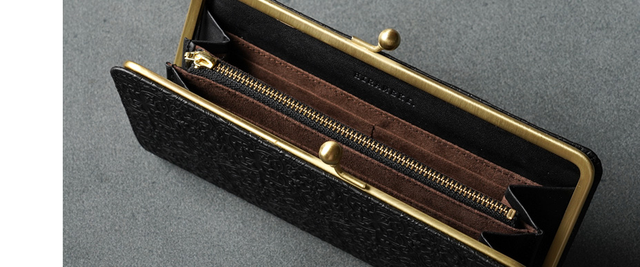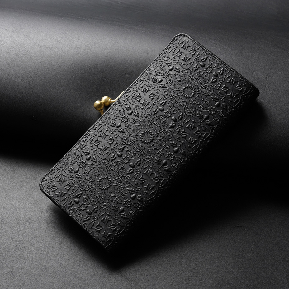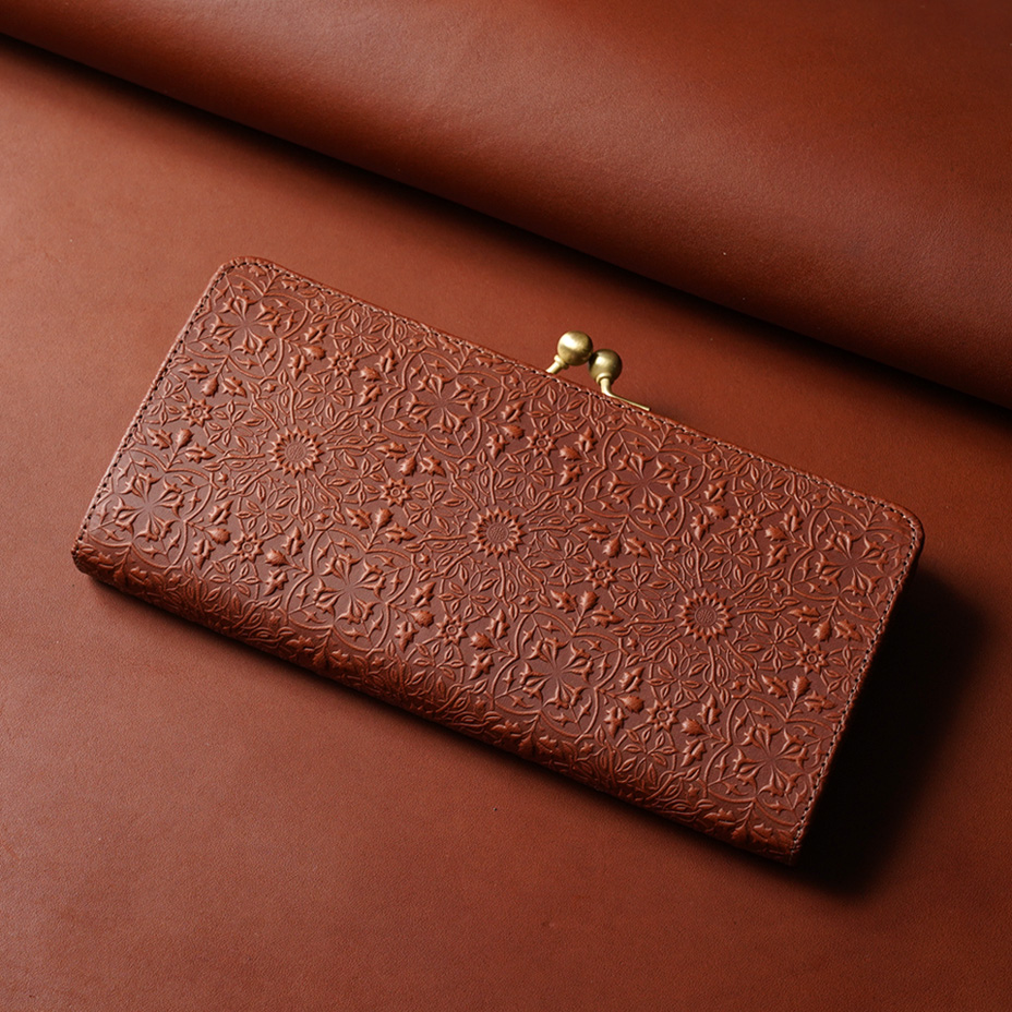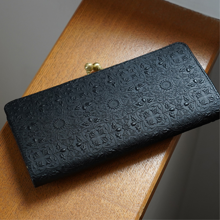 ウィリアム・モリスの装飾的なデザインが美しい、ガマグチタイプのスリムな長財布。使うほどに味わい深く育つ牛革に、特注の金属版で立体模型を施した、趣あるシリーズです。