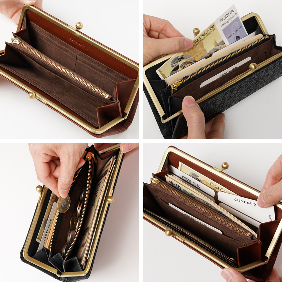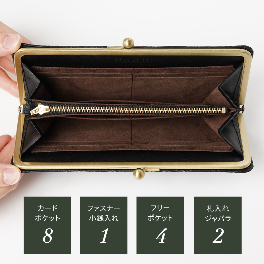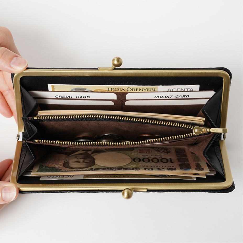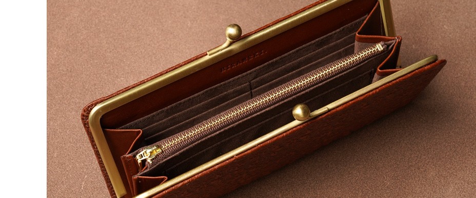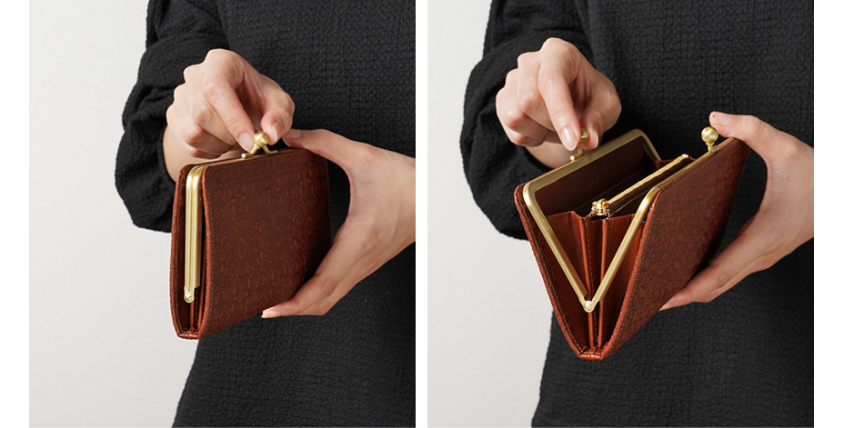ワンタッチ開閉の使い勝手のよさはガマグチ最大の魅力。スリムに仕立てられたデザインは女性の手でも持ちやすく、見た目にもスマートな印象に。