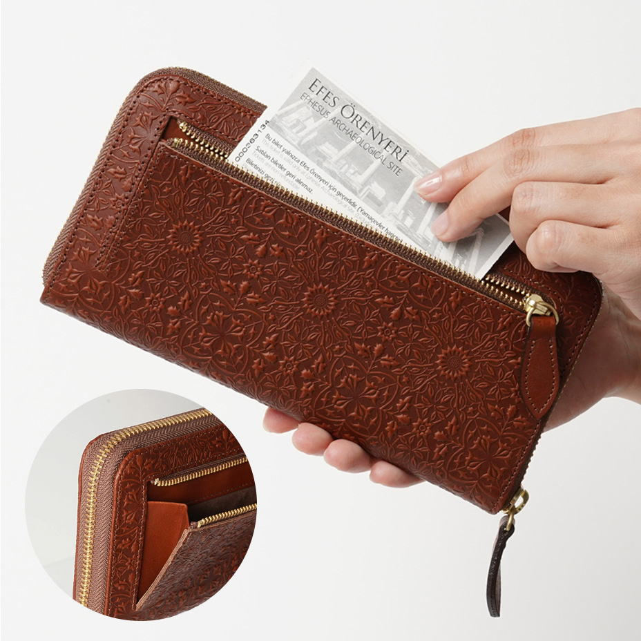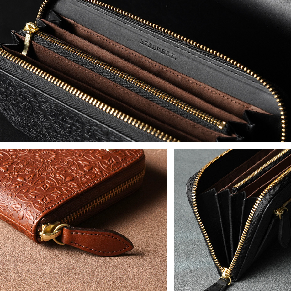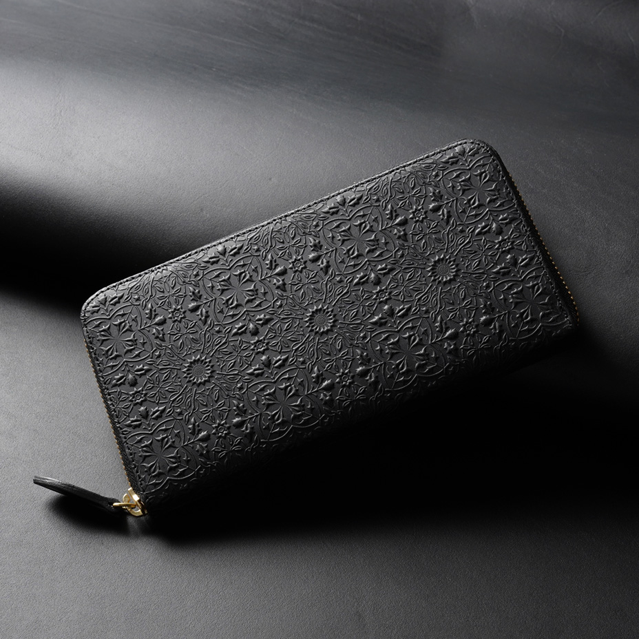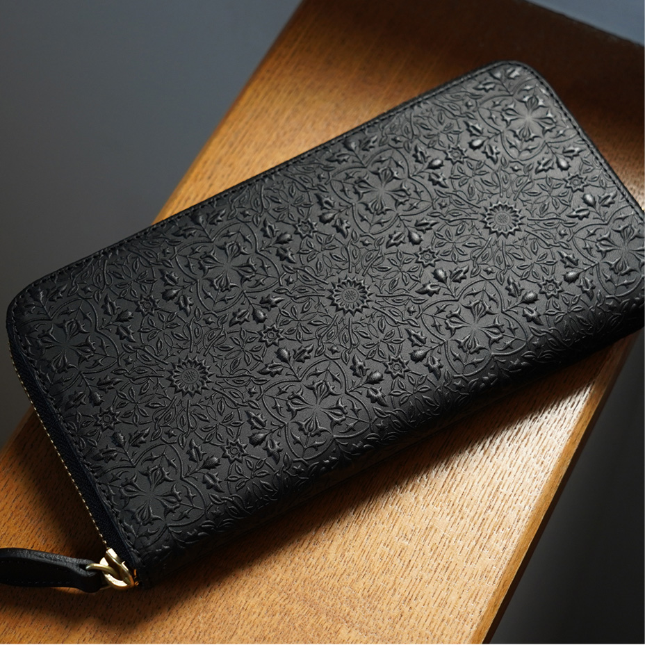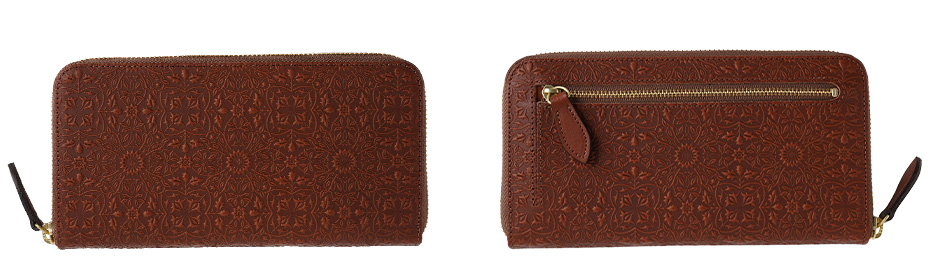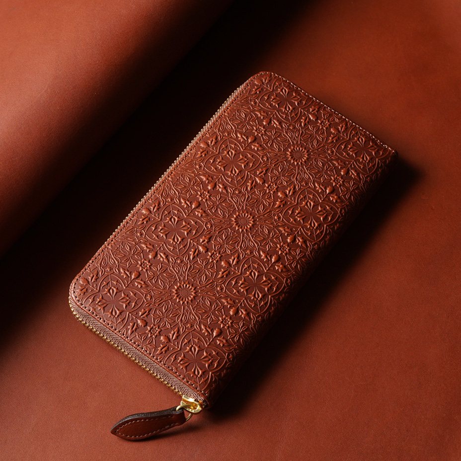 ウィリアム・モリスの装飾的なデザインが美しい、ラウンドファスナータイプの長財布。使うほどに味わい深く育つ牛革に、特注の金属版で立体模様を施した、趣あるシリーズです。