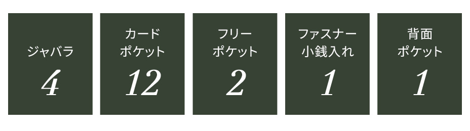 大きく広がる4つのジャバラに12のカードポケットを備えた、仕分けしやすく、大容量の長財布。通帳もおさまるサイズ感で、収納力抜群です。