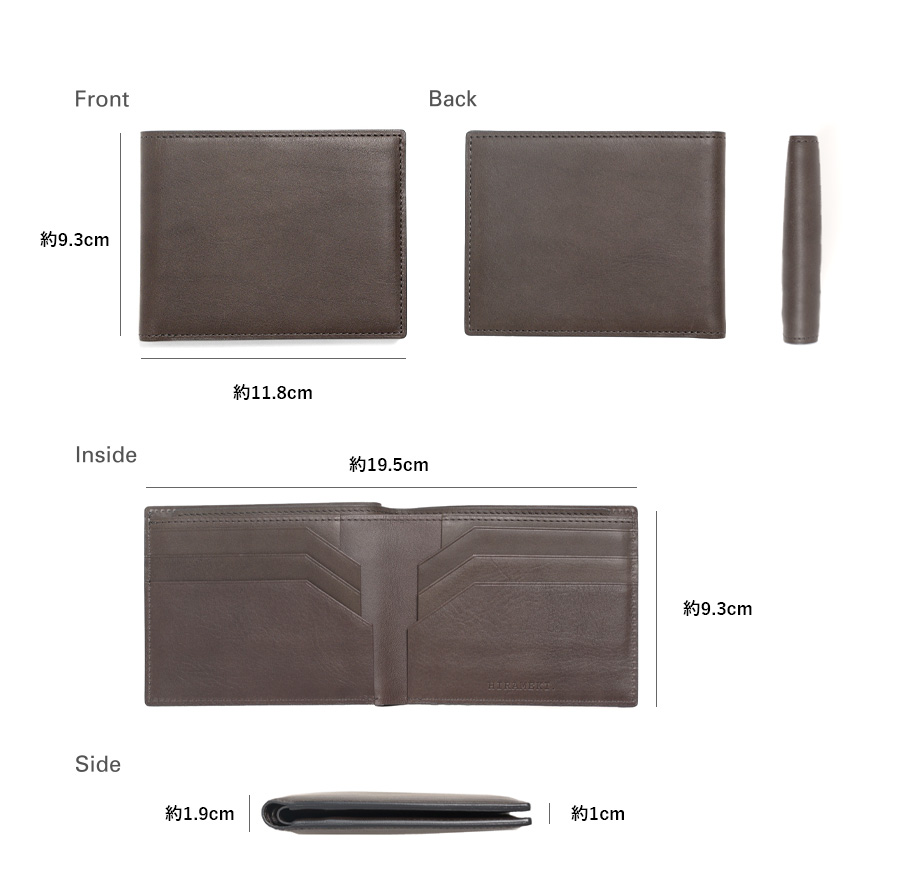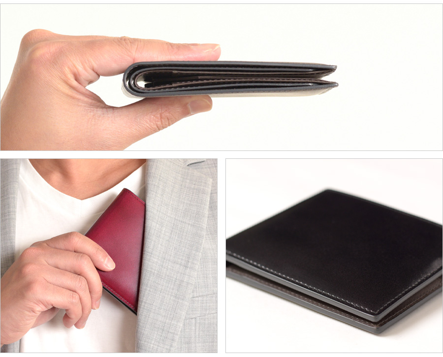 熟練の職人の技術によって実現した、最大幅2cm以下のスリムな二つ折り財布は、小銭入れをなくし、カードとお札の収納に特化したスタイリッシュな仕様。 バッグや胸ポケットにもすっきりと収まり、スマートな大人の余裕を感じさせる。
