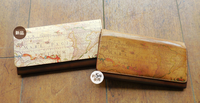 左:新品のアートヌメレザー長財布 / 右:約5年間使用後 (デザイン:アンティークマップ)