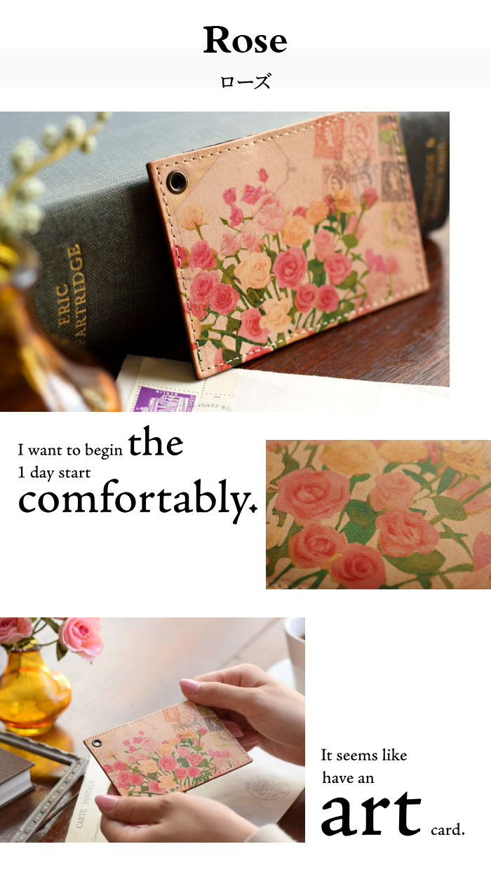 HIRAMEKI.デザイナーによる、オリジナルデザインです。 薄いクリーム色のバラから、鮮やかなピンクのバラまで、 優しいアンティークな色合いが特徴の薔薇の花束が華やかなローズ。 1950年~1960年代にイギリスで実際に使用されていた エリザベス女王デザインの切手が添えられ、 お財布を使っていくにつれて、よりアンティークな雰囲気を 楽しめるデザインとなっています。