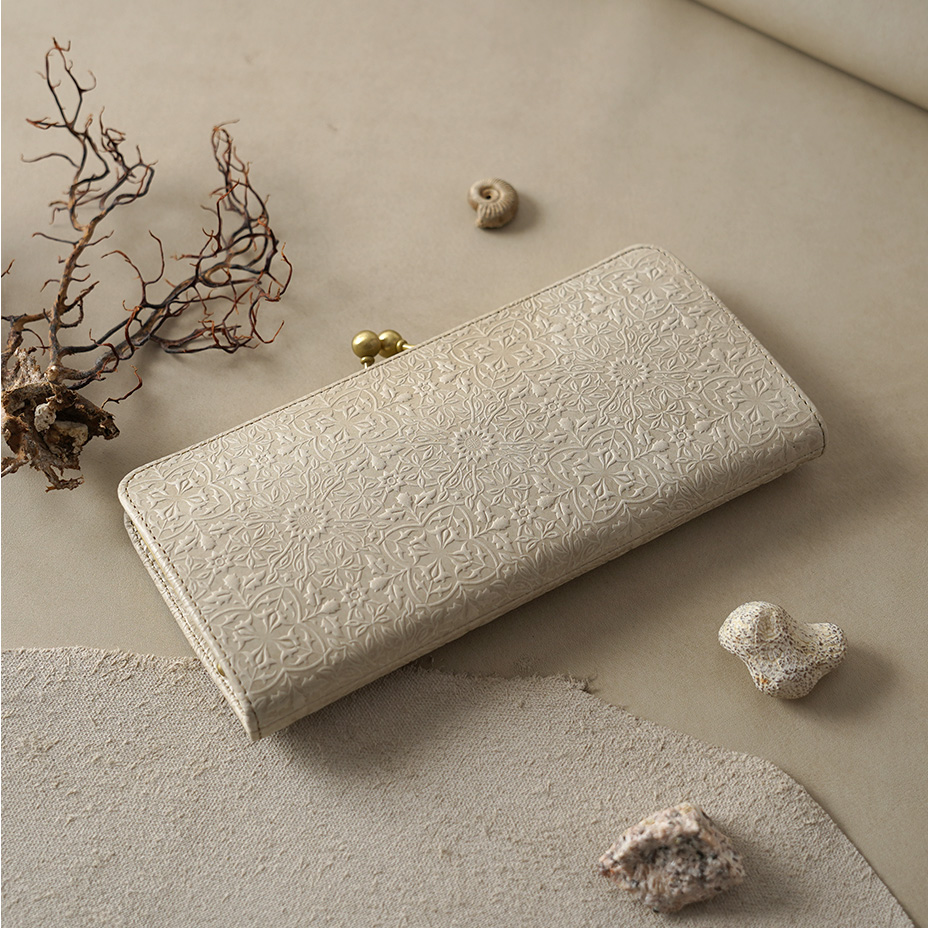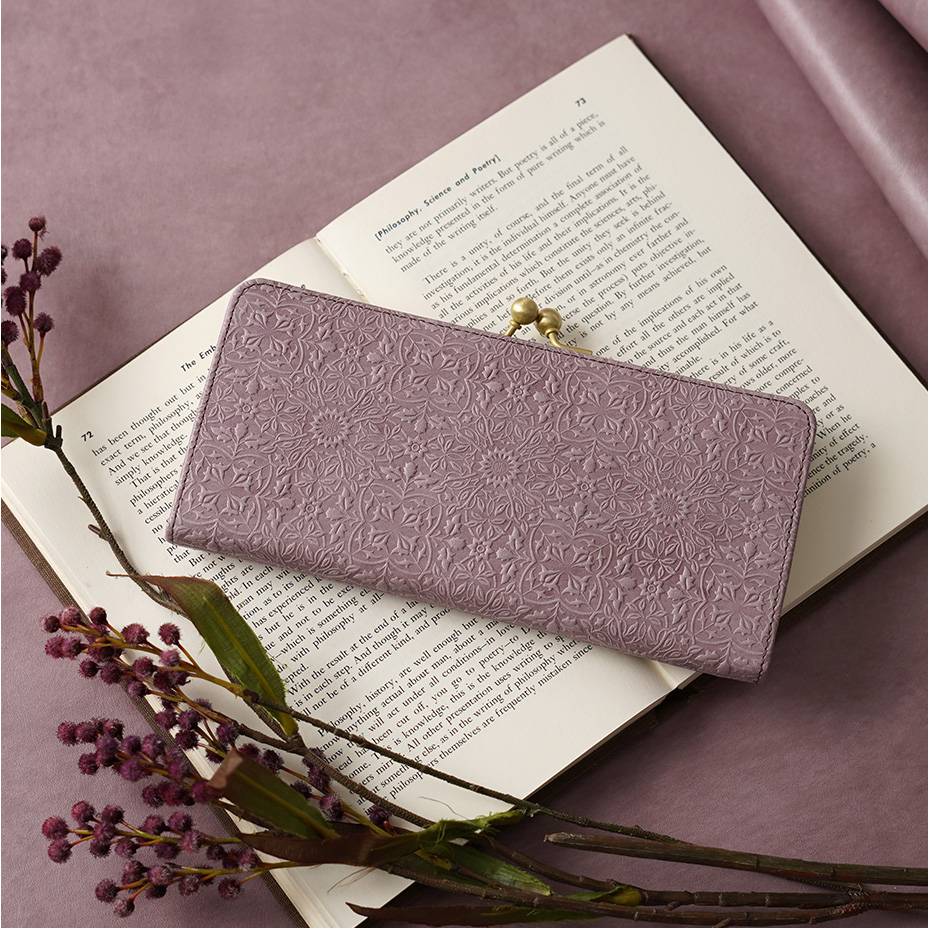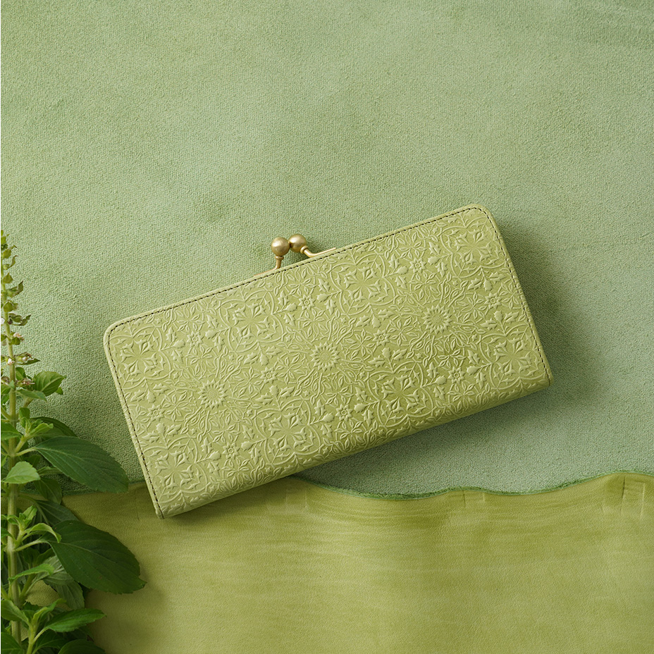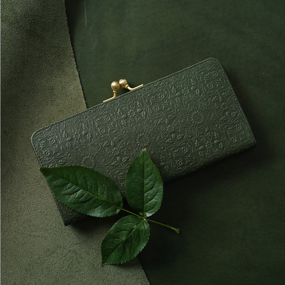 ウィリアム・モリスの美しい植物模様を革に型押しした、薄型のガマグチ長財布です。スリムな見た目と、口金をひねるだけの動作で開閉できる手軽さが魅力。中身の出し入れもスムーズに、無駄なく考えられたデザインで、一度使うと離れられない快適な使い心地が特長です。