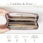 カードポケット計10か所。小銭入れの両サイドにあるポケットは、通常のクレジットカードより少しだけ大きい作りに。クリアケースに入れたマイナカードや、お守りなどをお財布に入れて持ち歩く方にも。