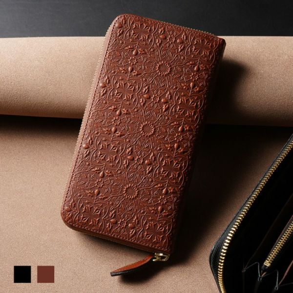 ウィリアム・モリスの装飾的なデザインが美しい、ラウンドファスナータイプの長財布。使うほどに味わい深く育つ牛革に、特注の金属版で立体模様を施した、趣あるシリーズです。